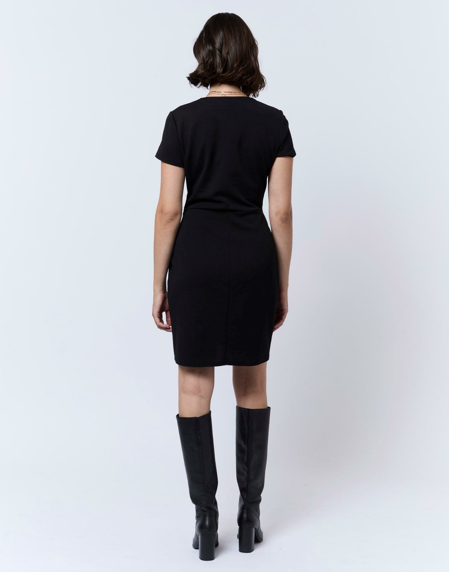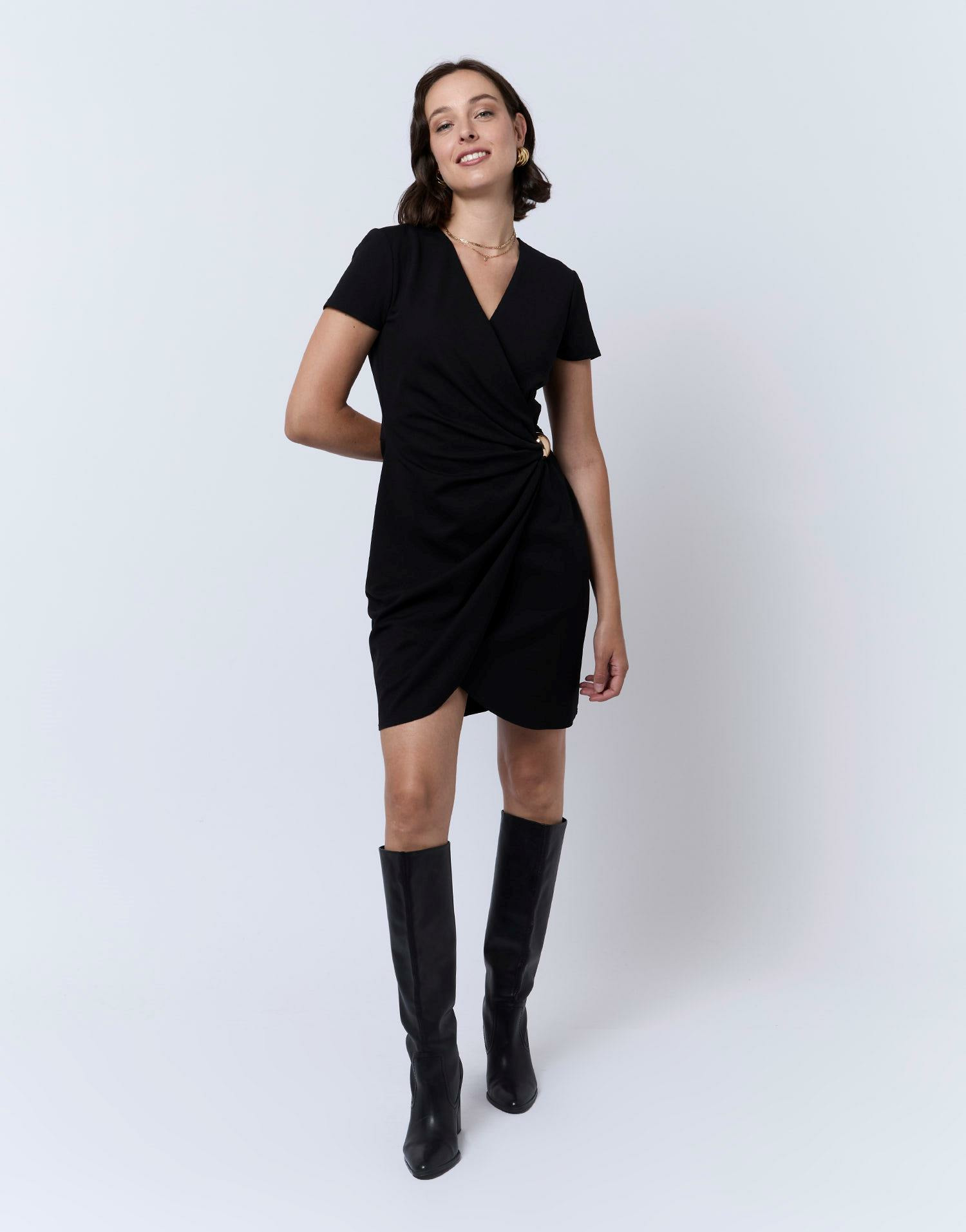 Robe courte unie noire, décolleté en V, taille ajustée avec effet drapé, détails dorés. Manon mesure 1m75 et porte une taille 38.