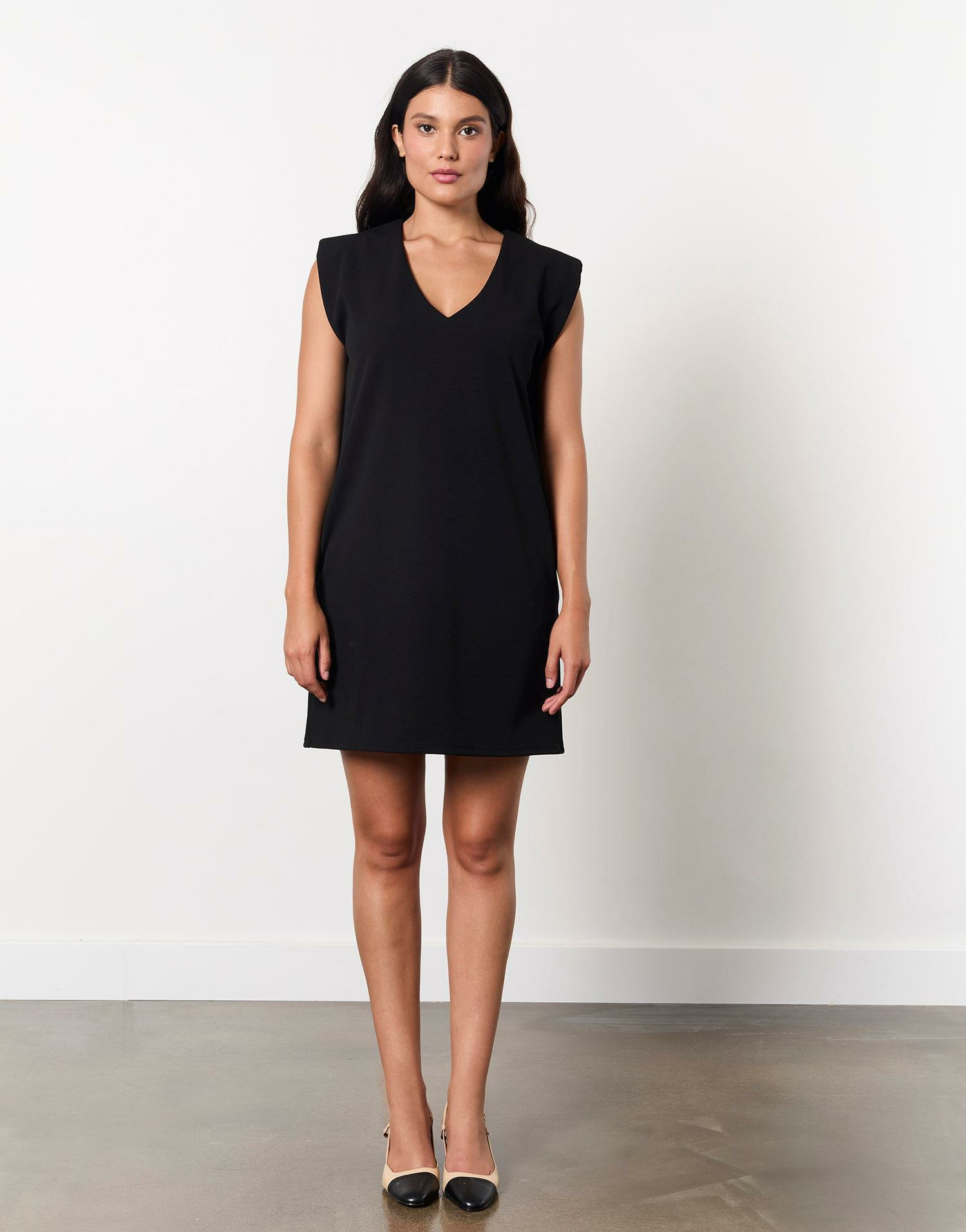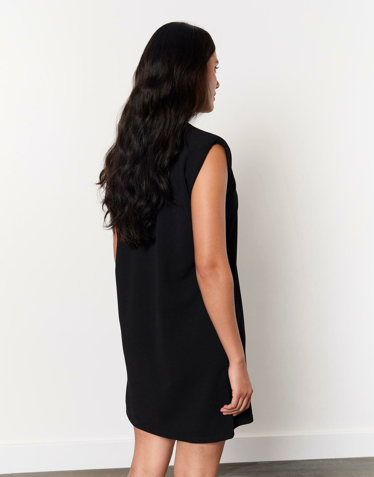 Robe droite sans manches avec épaulettes, encolure en V. Longueur courte, coupe ajustée. Disponible en taille 38 portée par le modèle mesurant 1m73.