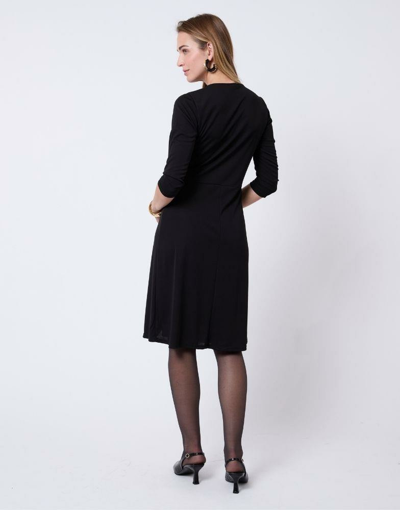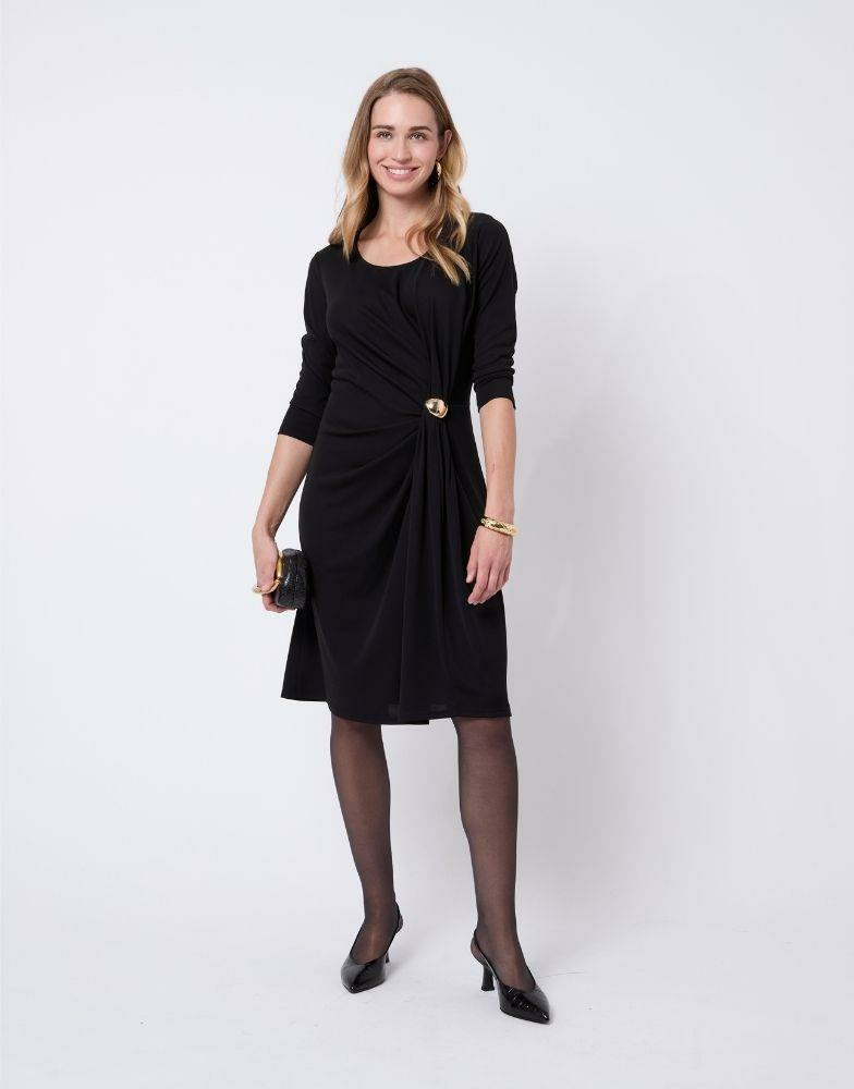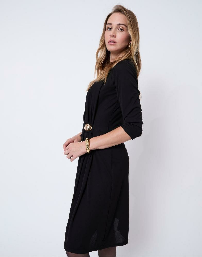 Robe courte unie noire, encolure arrondie, manches 3/4, taille ajustée avec bijoux dorés, effet drapé. Bineta mesure 1m75 et porte une taille 38.