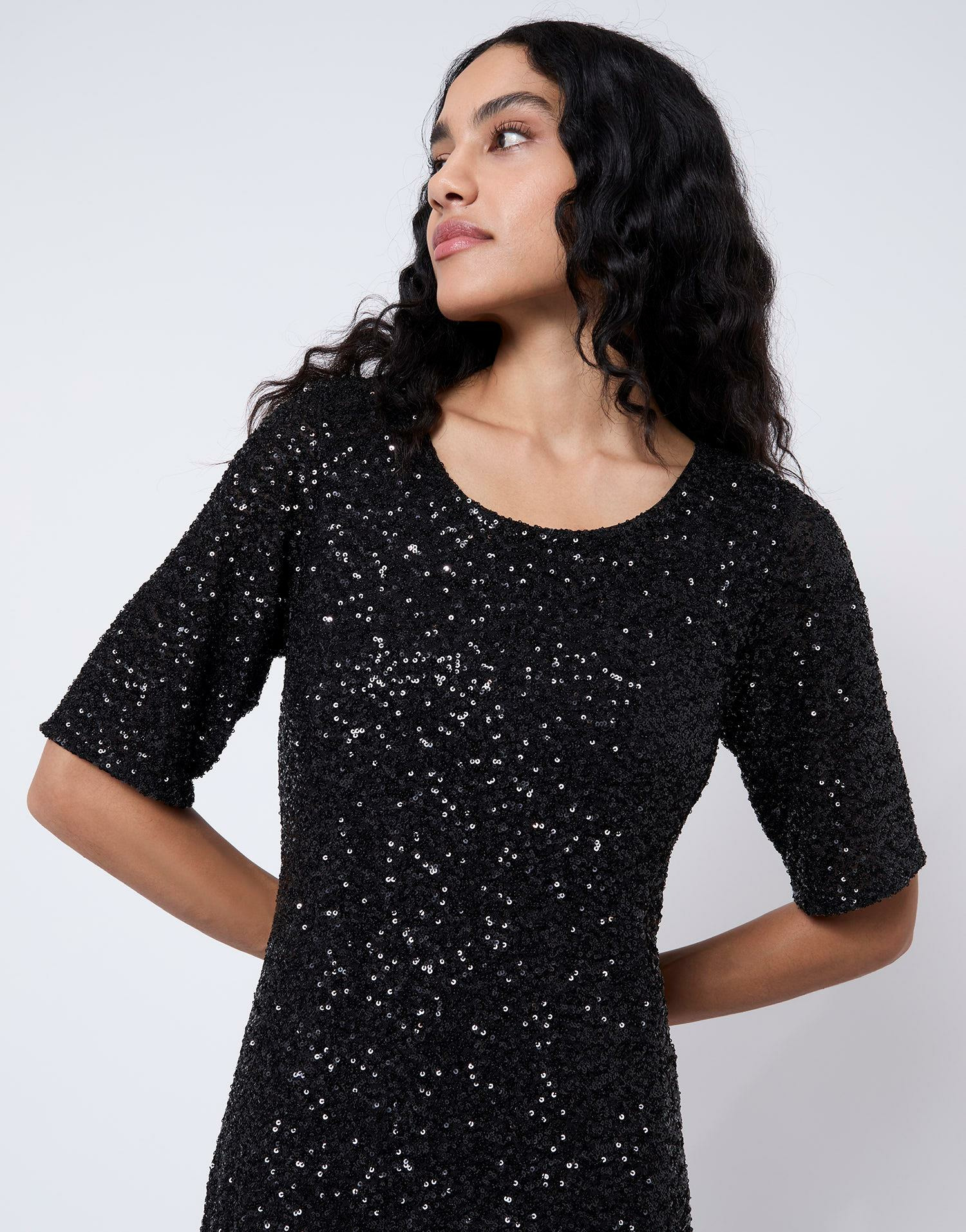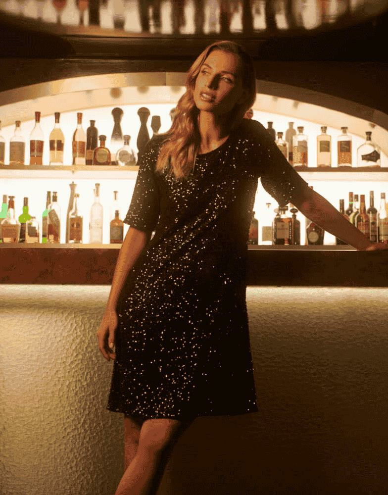 Conçue en maille fluide, cette robe délicatement évasée épouse vos mouvements avec légèreté. Son encolure arrondie et sa taille non marquée assurent un confort optimal, tandis que les sequins discrets captent la lumière pour un effet brillant subtil. Les manches trois-quarts et le dos décolleté apportent une touche sophistiquée, soulignant la silhouette sans effort.