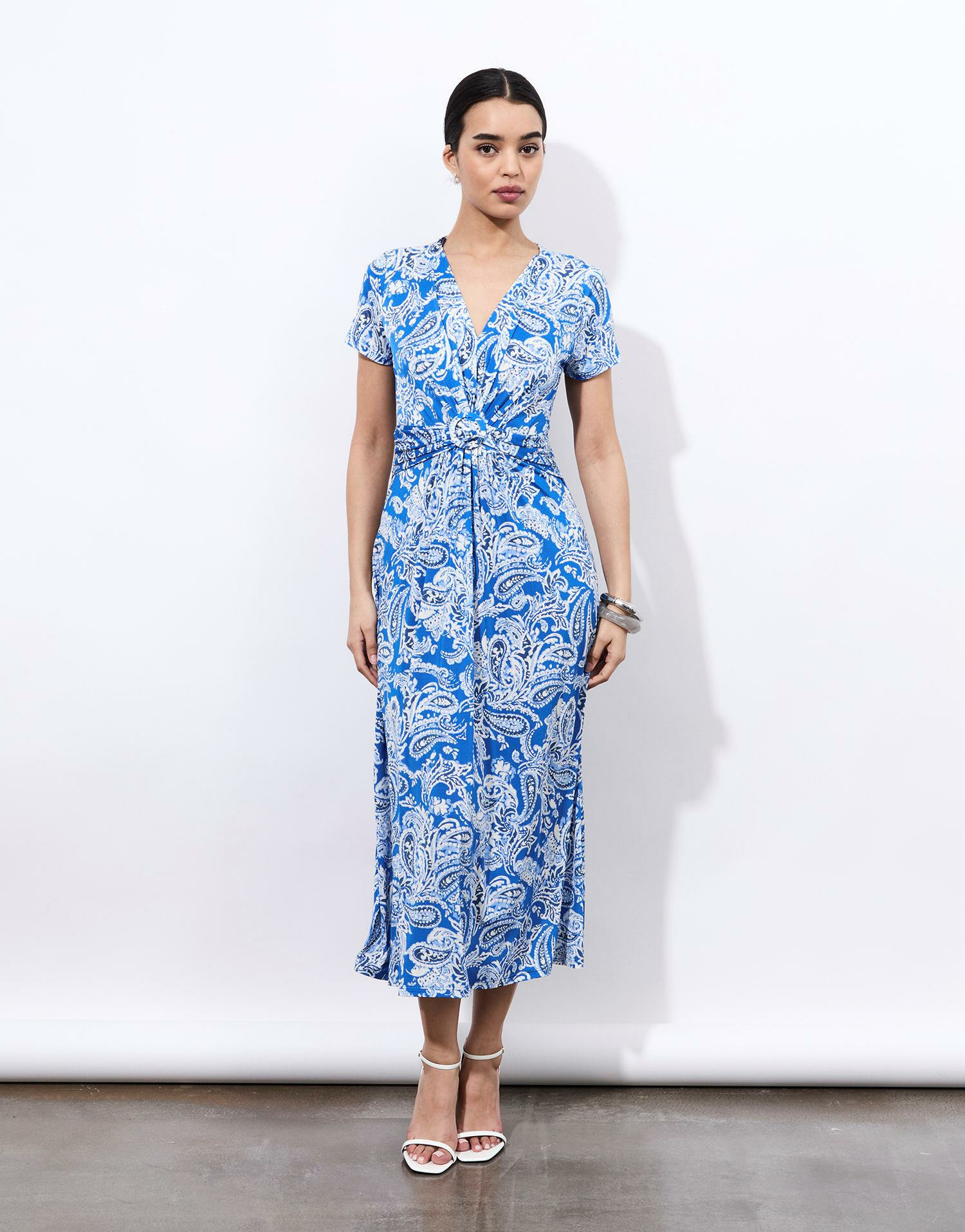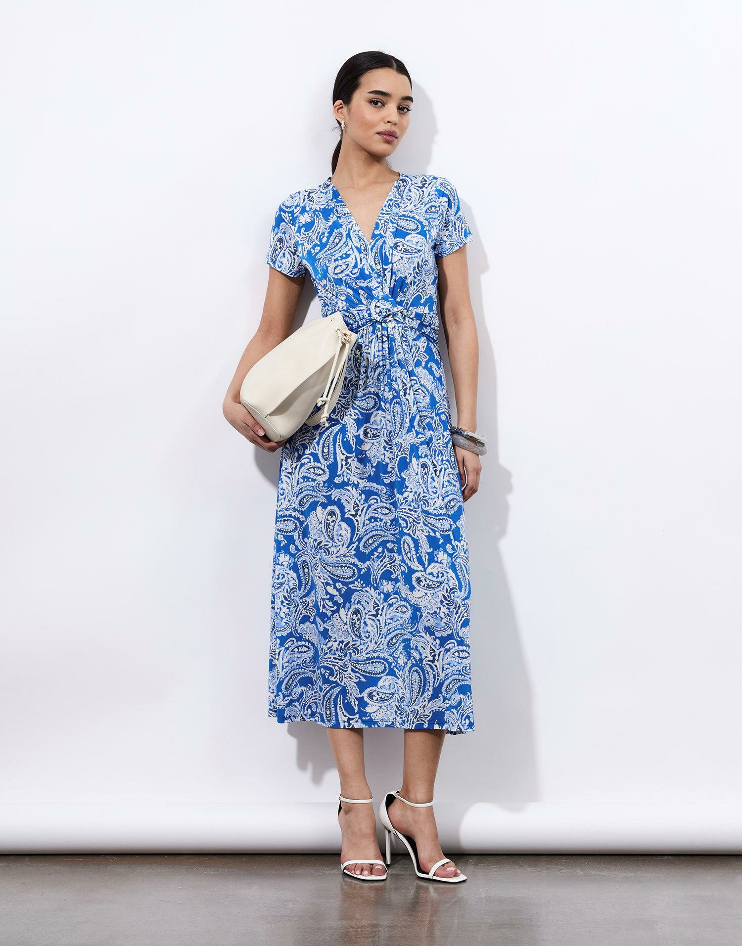 Robe longue imprimée avec encolure en V, manches courtes, détail noué à la taille. Coupe fluide pour un tombé naturel. La mannequin mesure 1m75 et porte une taille S.