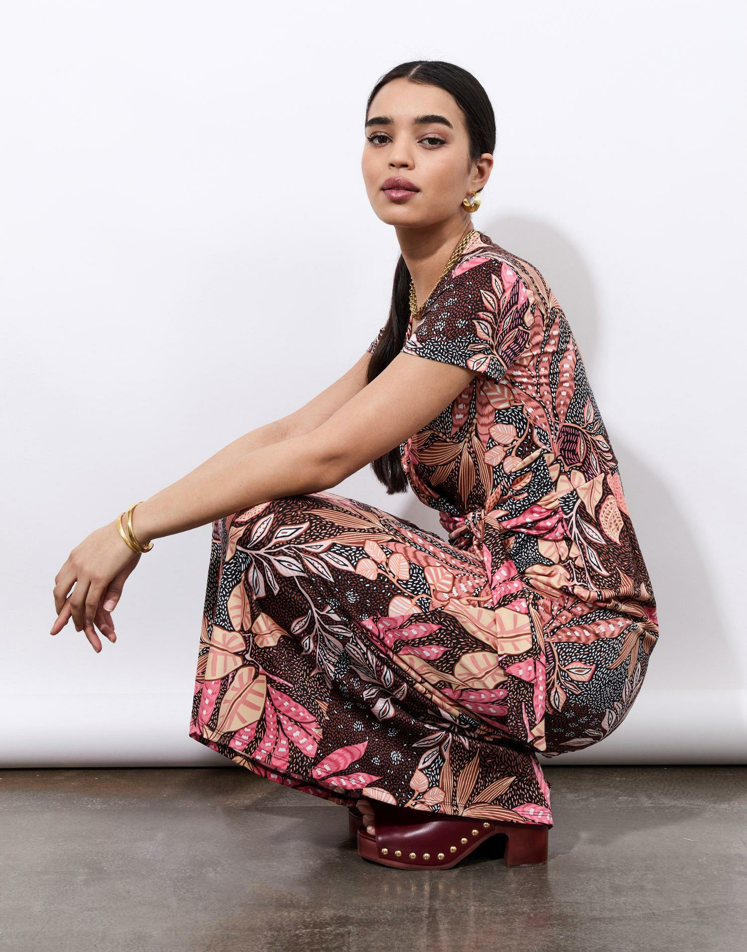Robe longue imprimée végétal aux tons marron. Encolure croisée, lien à nouer sur le côté pour ajuster la taille. Manches courtes pour plus de confort. La mannequin mesure 1m75 et porte une taille 38.