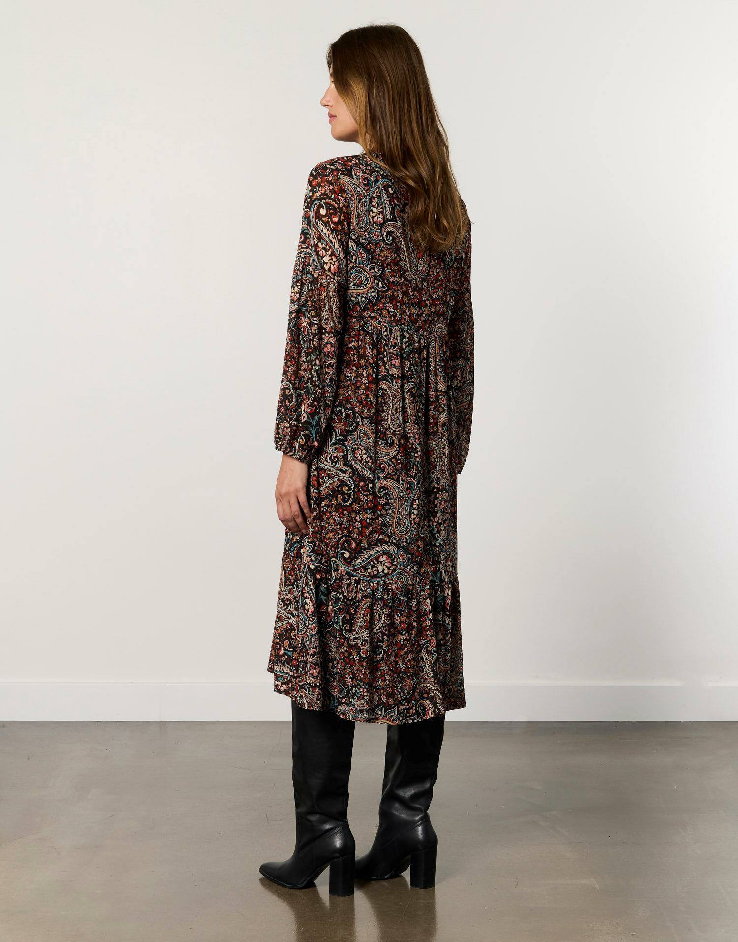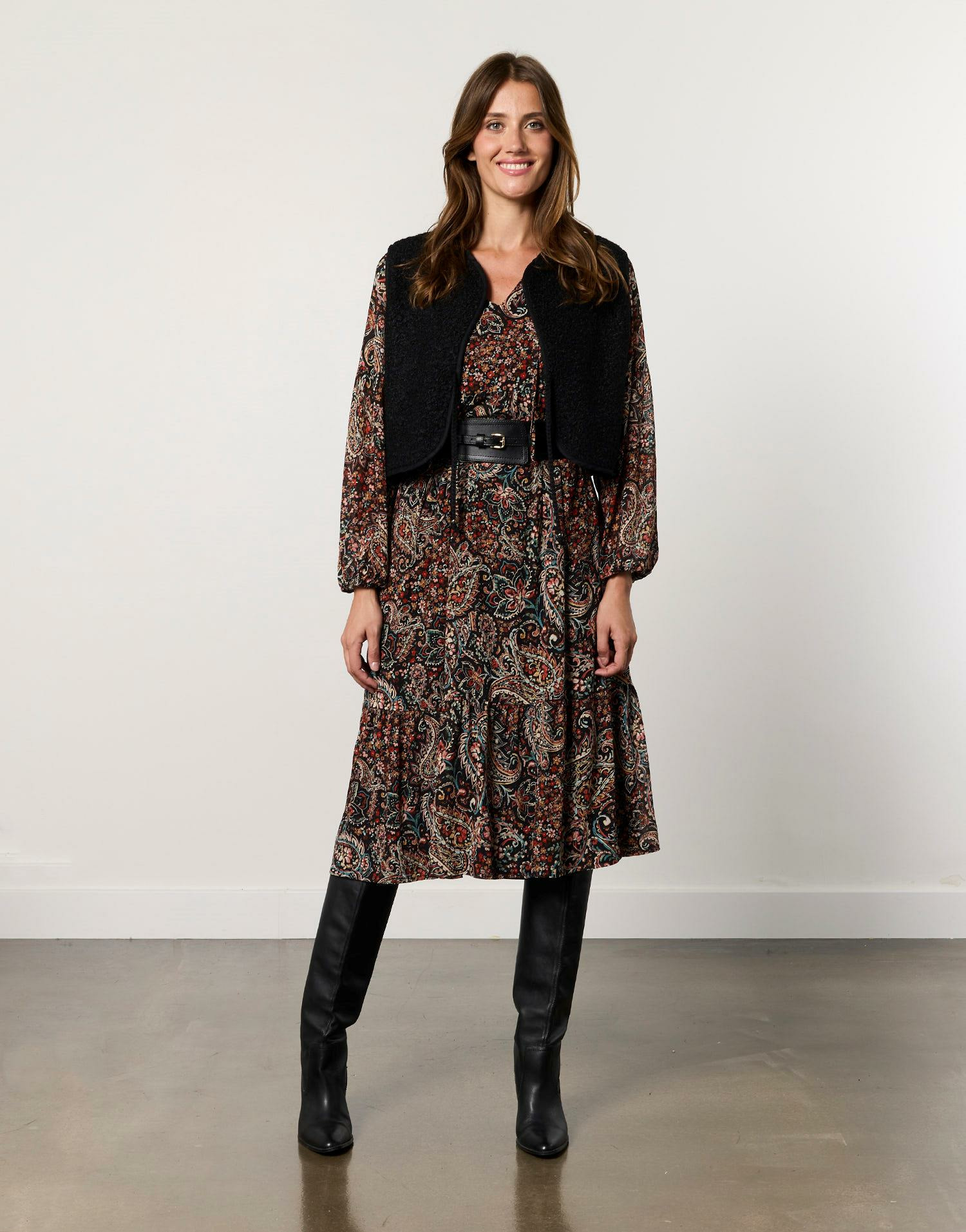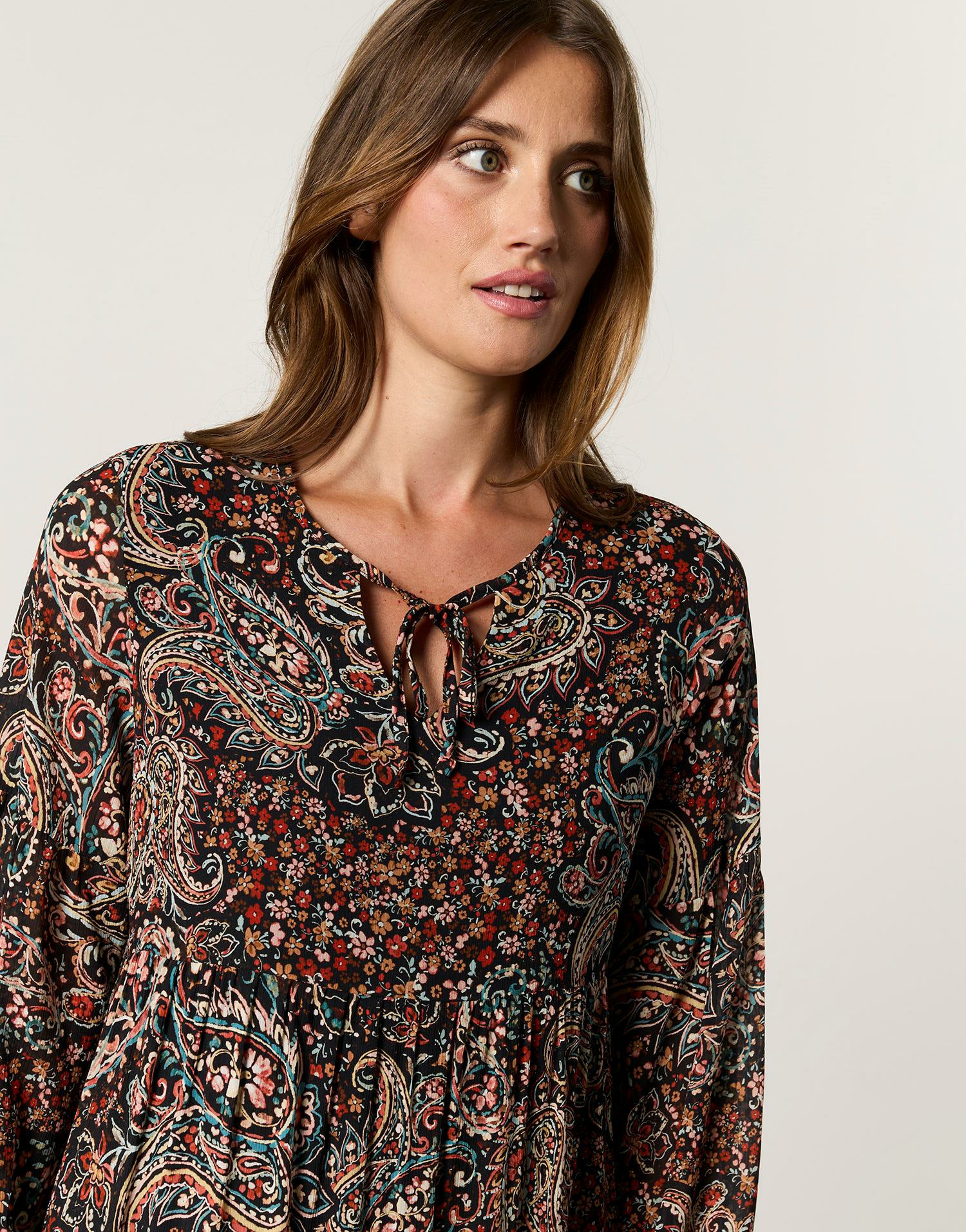 Disponible en taille 38 portée par Armelle, qui mesure 1m79. Manches légèrement bouffantes, longueur longue, imprimé cachemire noir.