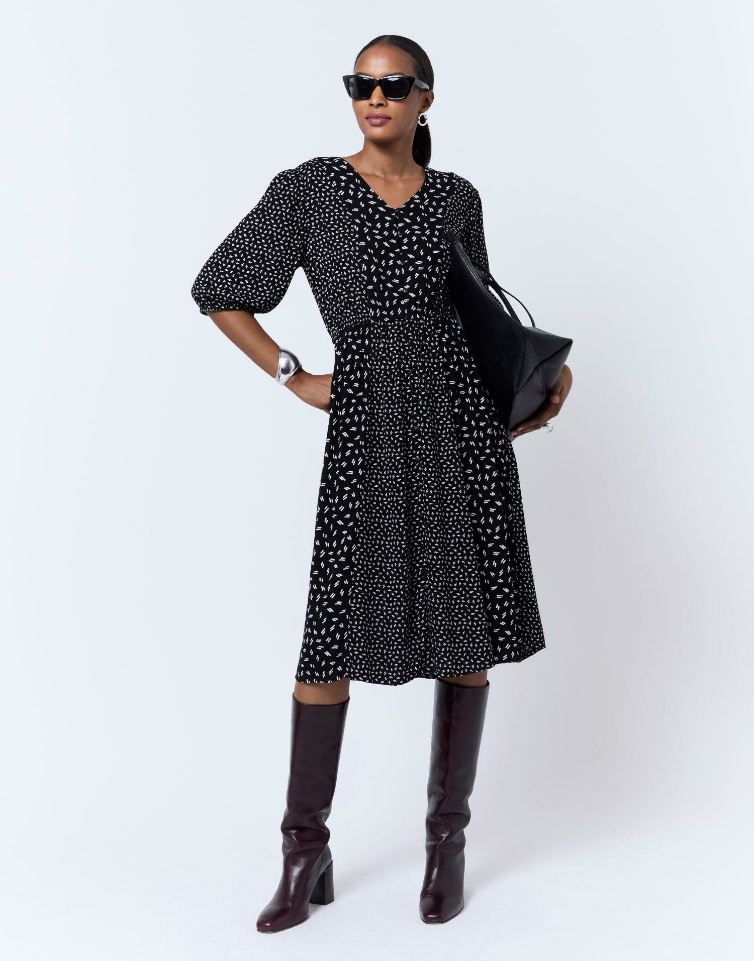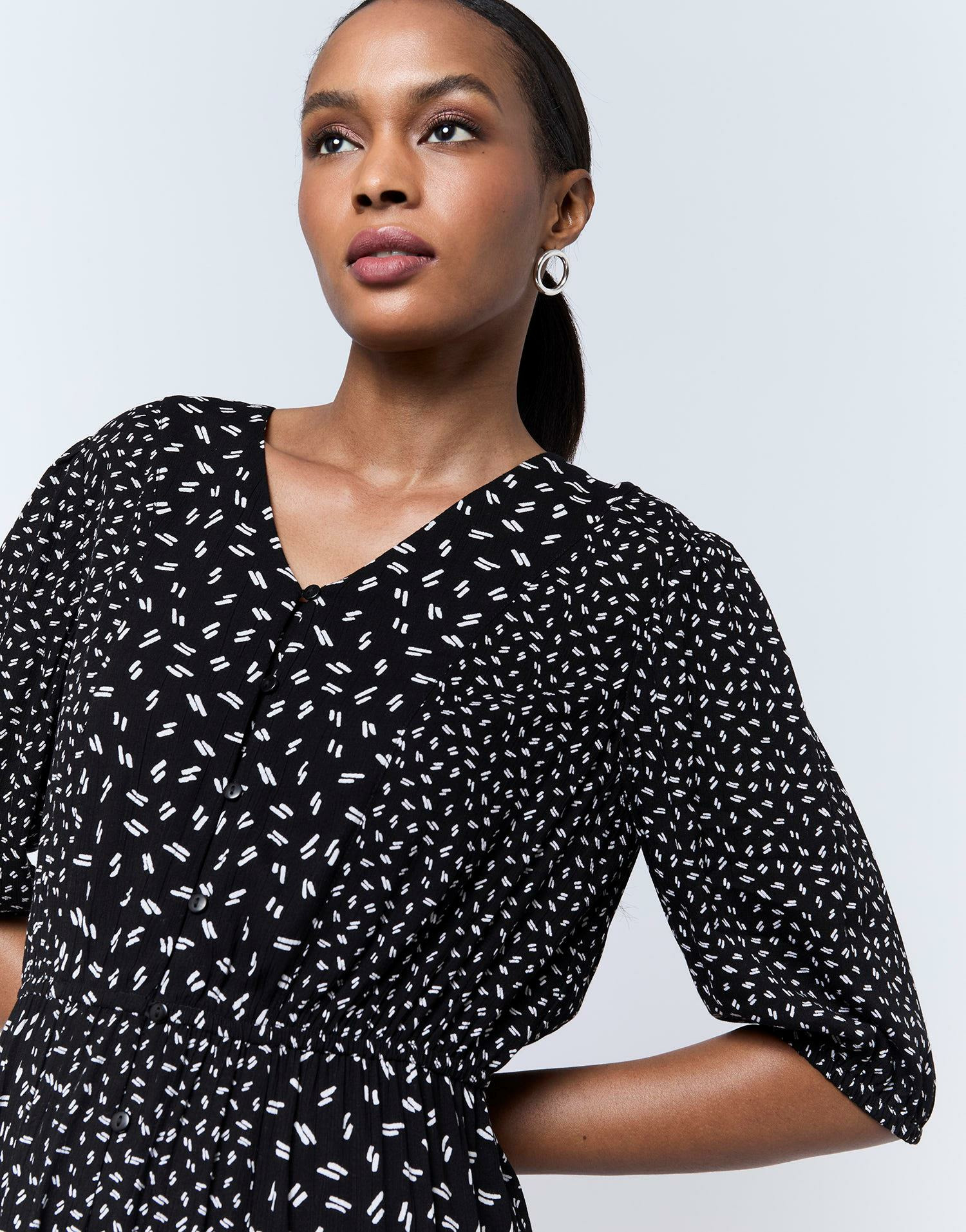 La mannequin mesure 1m75 et porte une taille 38. Robe midi noire imprimée de pois et traits graphiques. Encolure en V. Manches 3/4. Coupe fluide et raffinée.