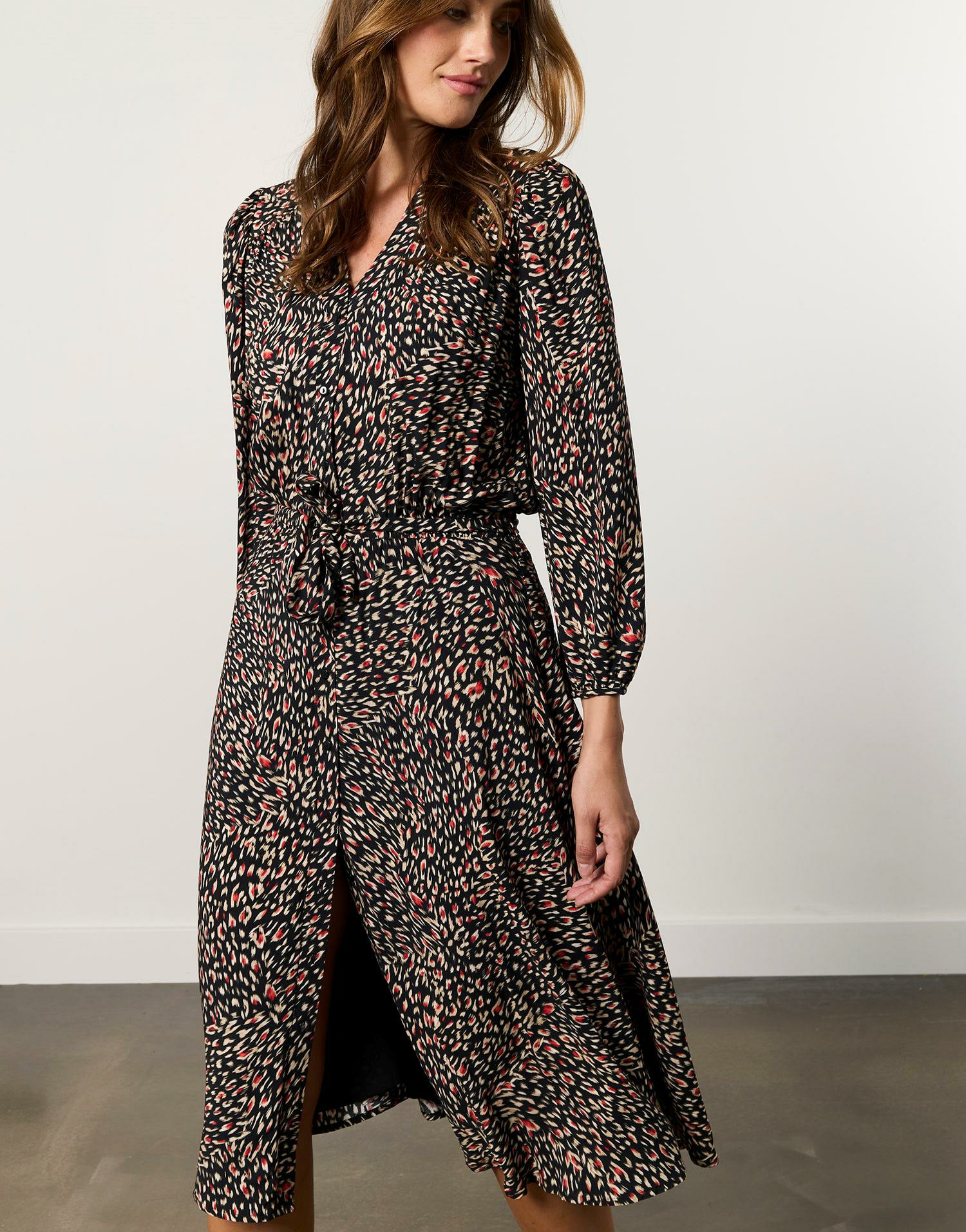 Coupe droite, décolleté en V, ceinture en tissu, taille élastiquée, longueur midi. Léo mesure 1m77 et porte cette robe pour une présentation parfaite.