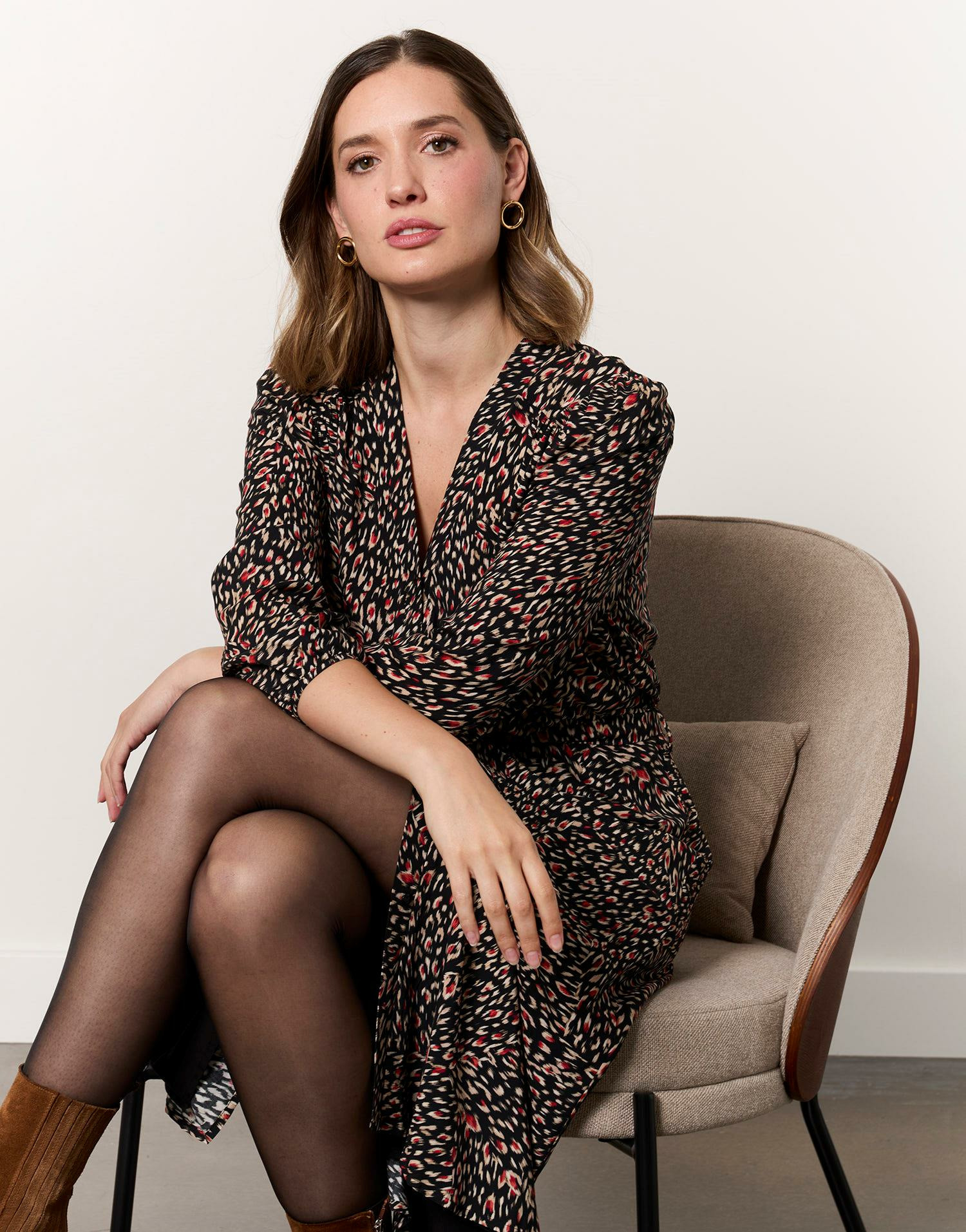 Adoptez l’élégance sans effort avec cette robe midi imprimée noire signée RIU Paris. Sa coupe droite et son décolleté en V soulignent la silhouette avec finesse, pour un style à la fois moderne et intemporel.