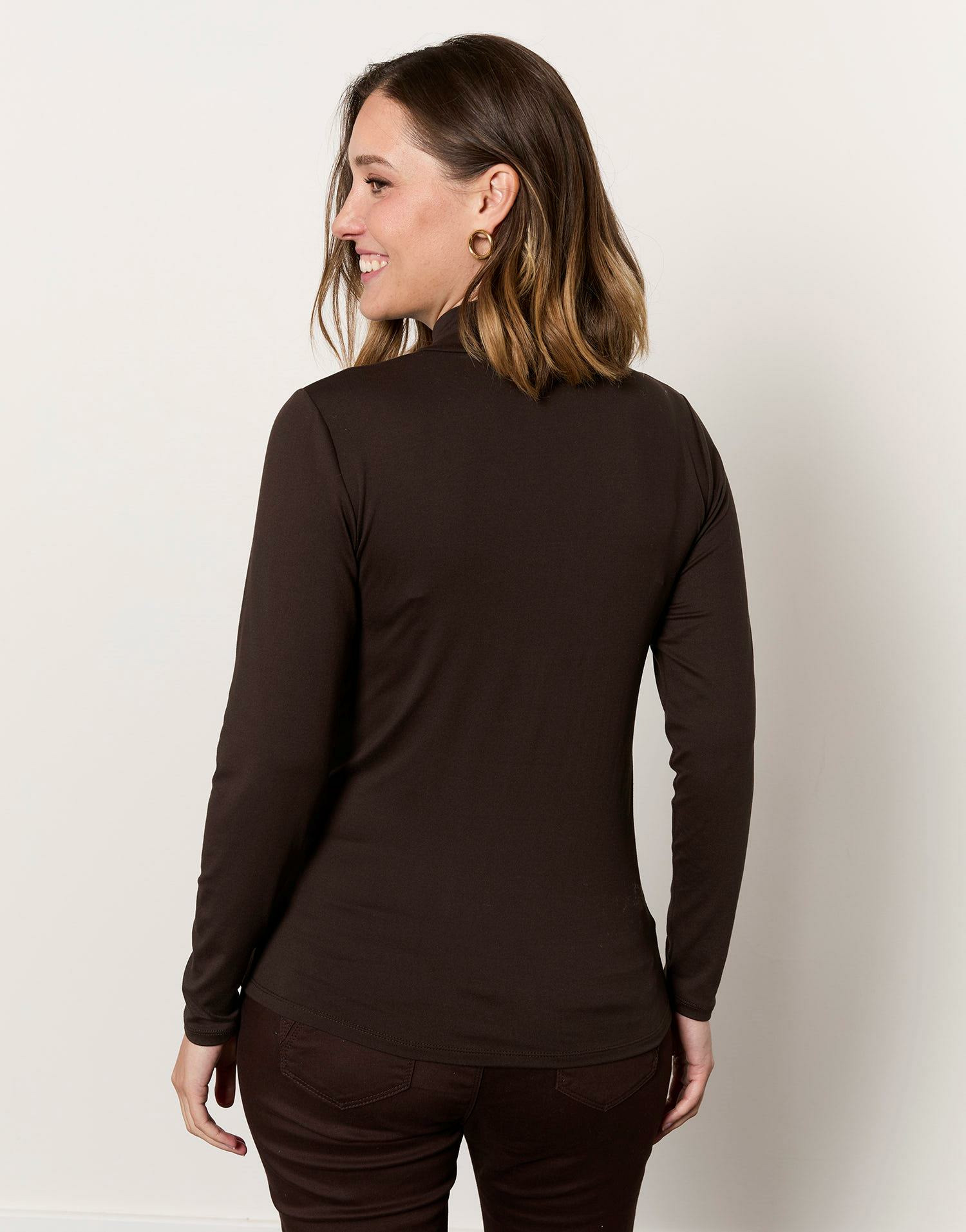 Question ? Ce sous-pull conserve-t-il sa couleur après lavage ? Réponse. Oui, la teinte marron est stable et résistante au lavage, garantissant une longue tenue dans le temps.