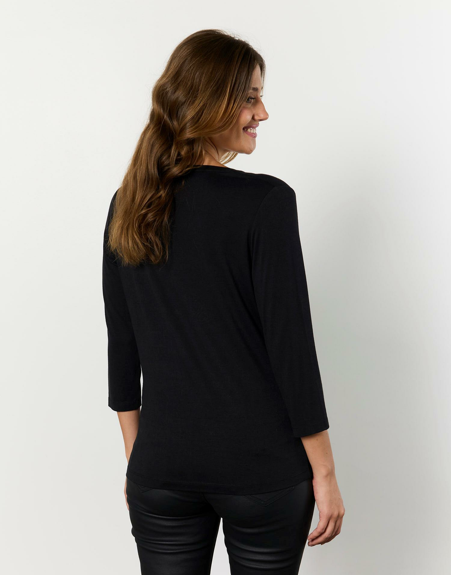 Osez un look festif et élégant avec ce t-shirt manches 3/4 noir, sublimé par des sapins colorés et brillants. Parfait pour illuminer vos soirées d’hiver tout en restant confortable et stylée.