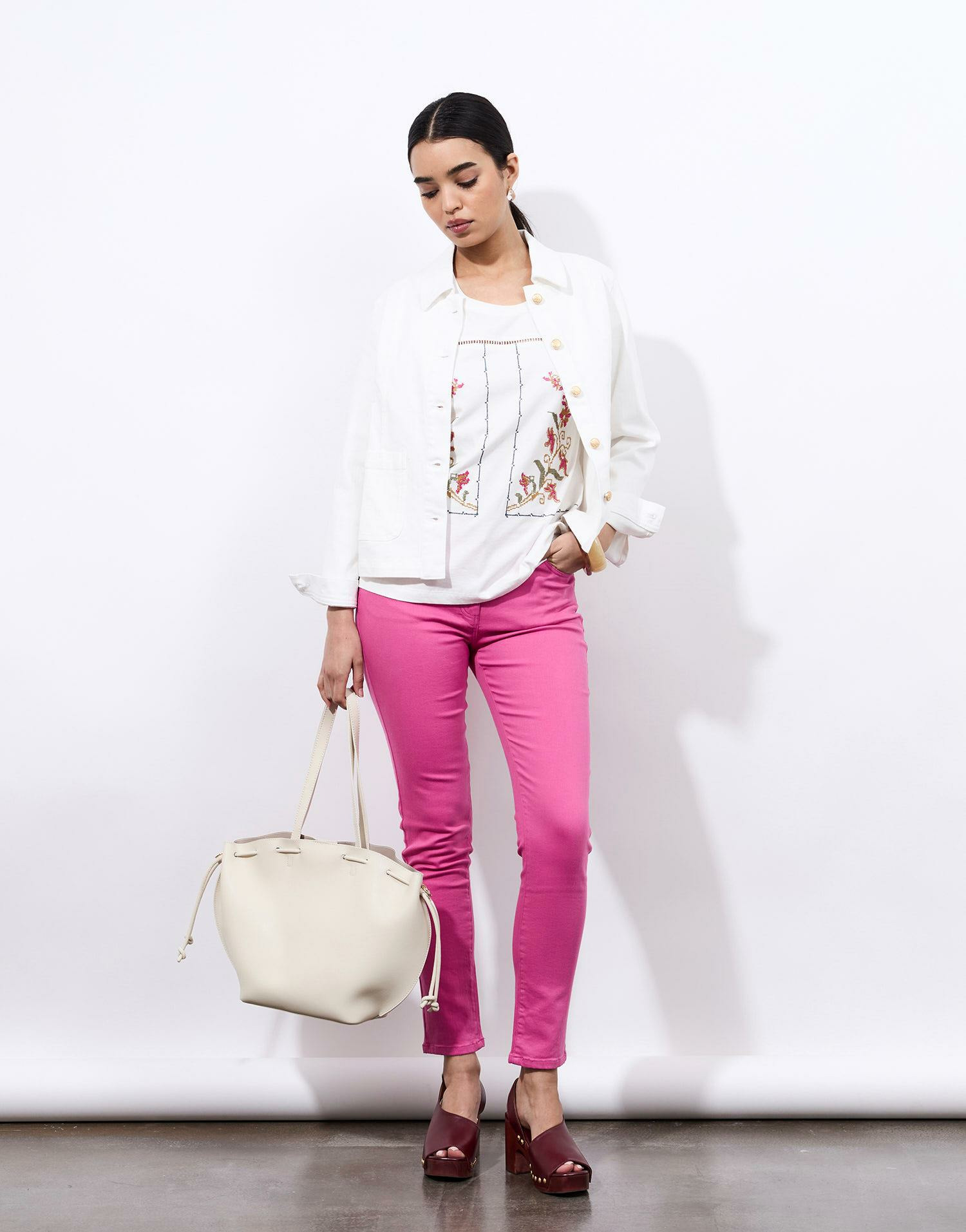 Confectionné en coton pur, ce t-shirt manches courtes offre une sensation de confort inégalée, idéale pour toutes vos journées actives. Sa coupe fluide épouse subtilement la silhouette, tandis que les broderies florales apportent une touche raffinée et féminine, parfaite pour rehausser un look casual ou plus travaillé. Facile à assortir, il s’intègre sans effort à votre garde-robe.