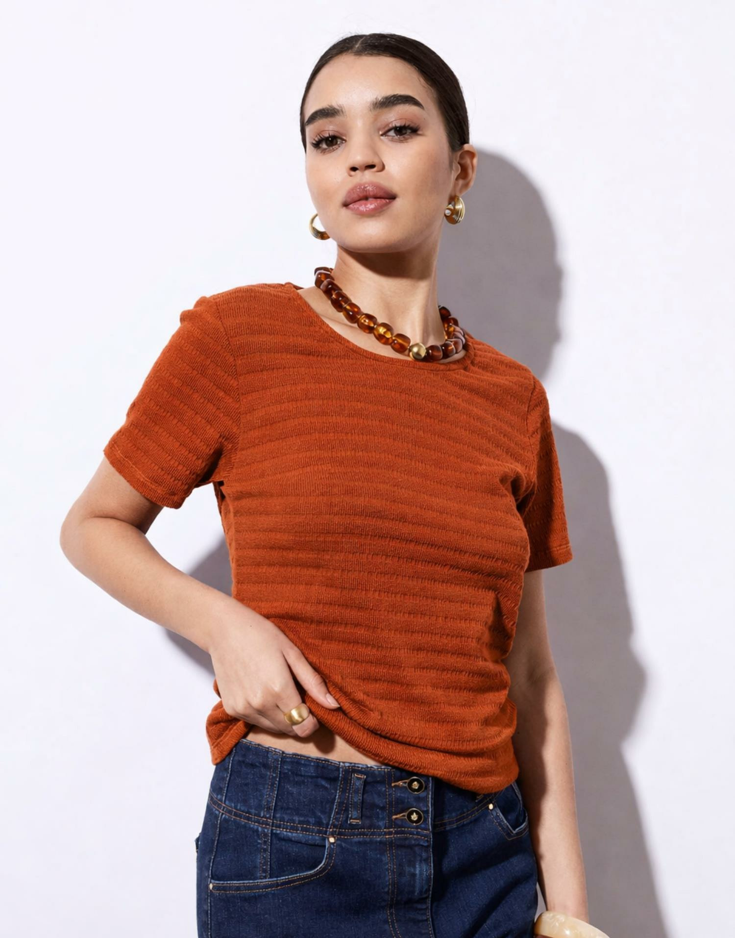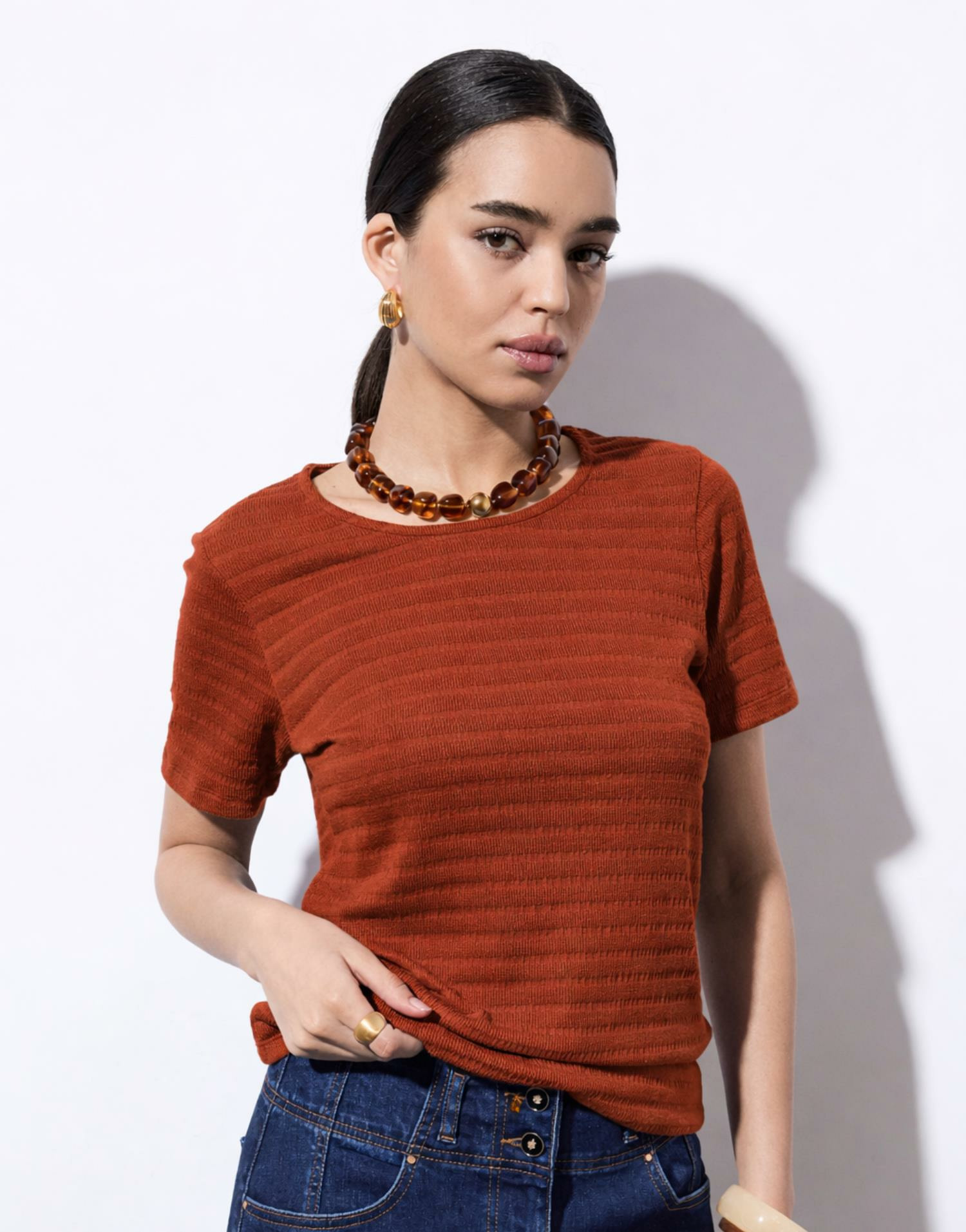Conçu pour accompagner vos journées avec légèreté, ce t-shirt manches courtes se distingue par sa matière douce et respirante. Sa teinte camel, subtile et chaleureuse, s’adapte facilement à toutes vos tenues, du jean aux jupes fluides. Le col rond classique souligne une silhouette épurée, tandis que la texture du tissu apporte une touche d’originalité discrète.