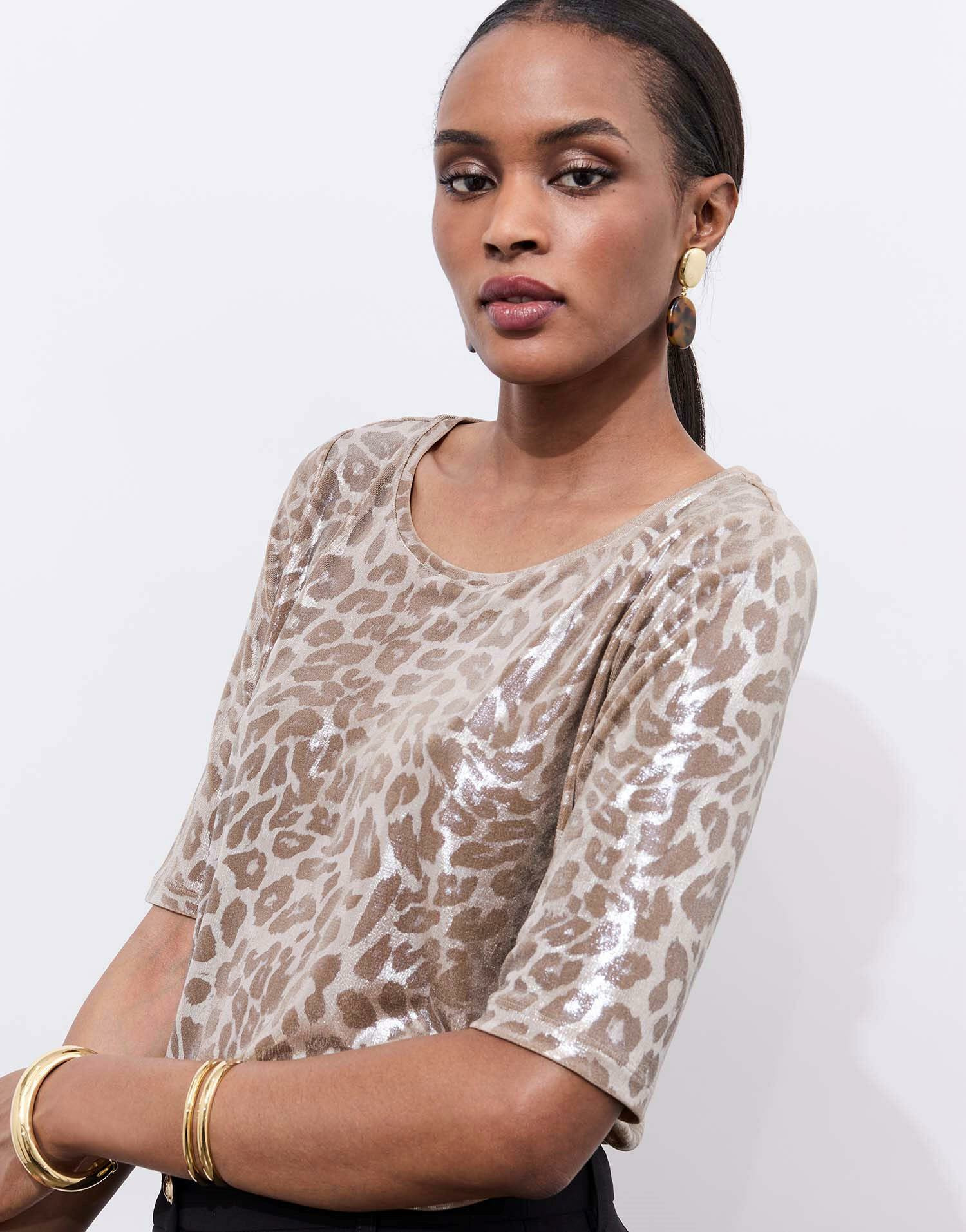 Affirmez votre style avec ce T-shirt beige à manches courtes, sublimé par un imprimé léopard audacieux. Une pièce incontournable pour dynamiser vos tenues quotidiennes avec élégance et caractère.