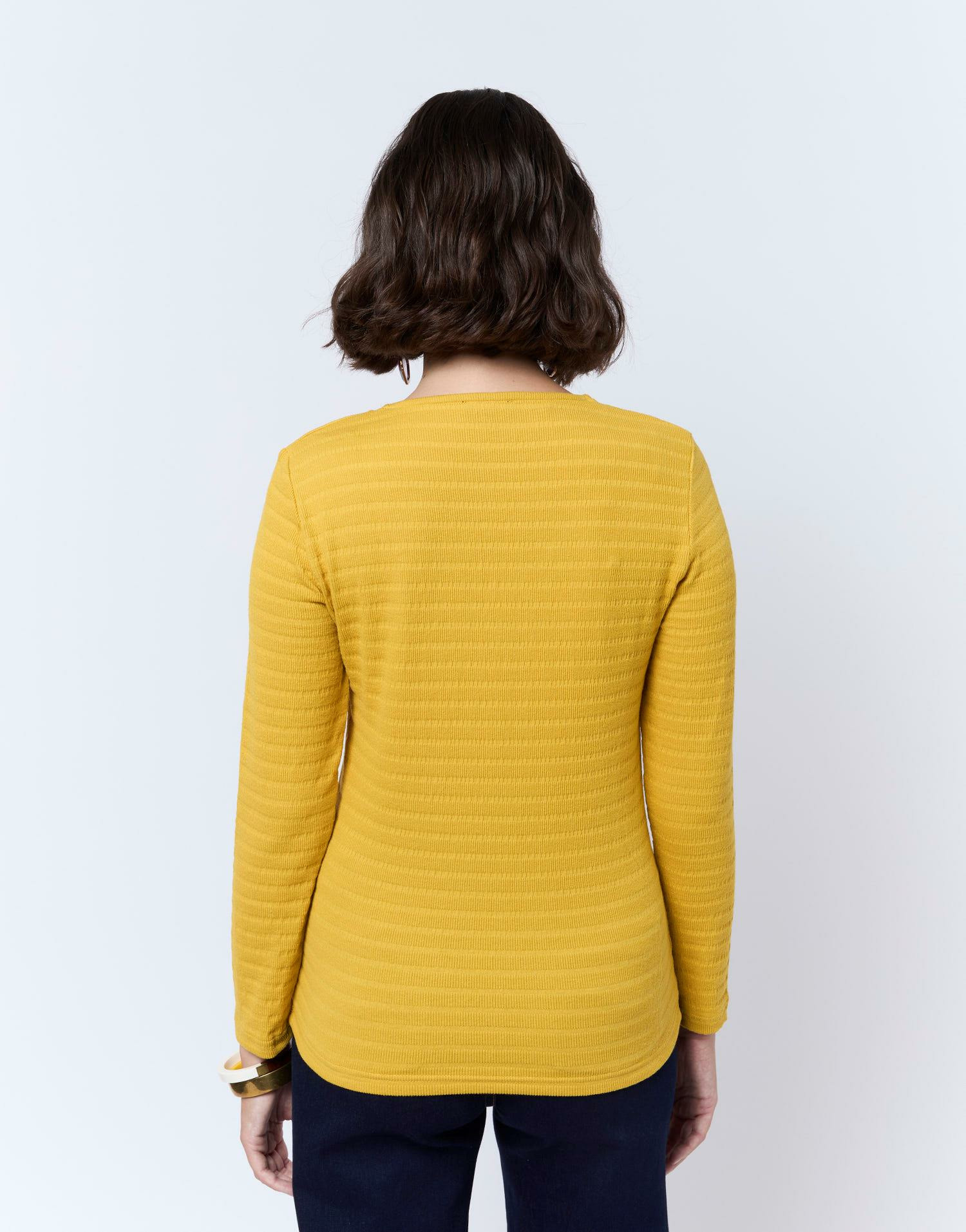 Apportez une touche lumineuse et raffinée à votre garde-robe avec ce t-shirt manches longues jaune signé RIU Paris. Une pièce essentielle qui allie simplicité et élégance pour sublimer vos looks du quotidien.