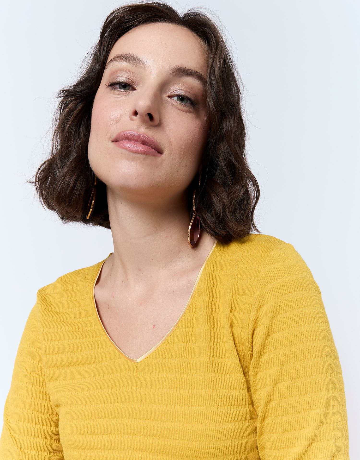 Matière : mélange coton. Couleur : jaune uni. Manches trois-quarts. Décolleté en V. Finitions satinées. Manon mesure 1m75 et porte une taille 1.
