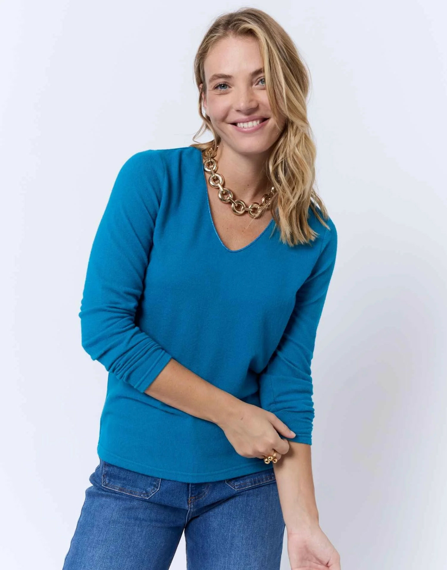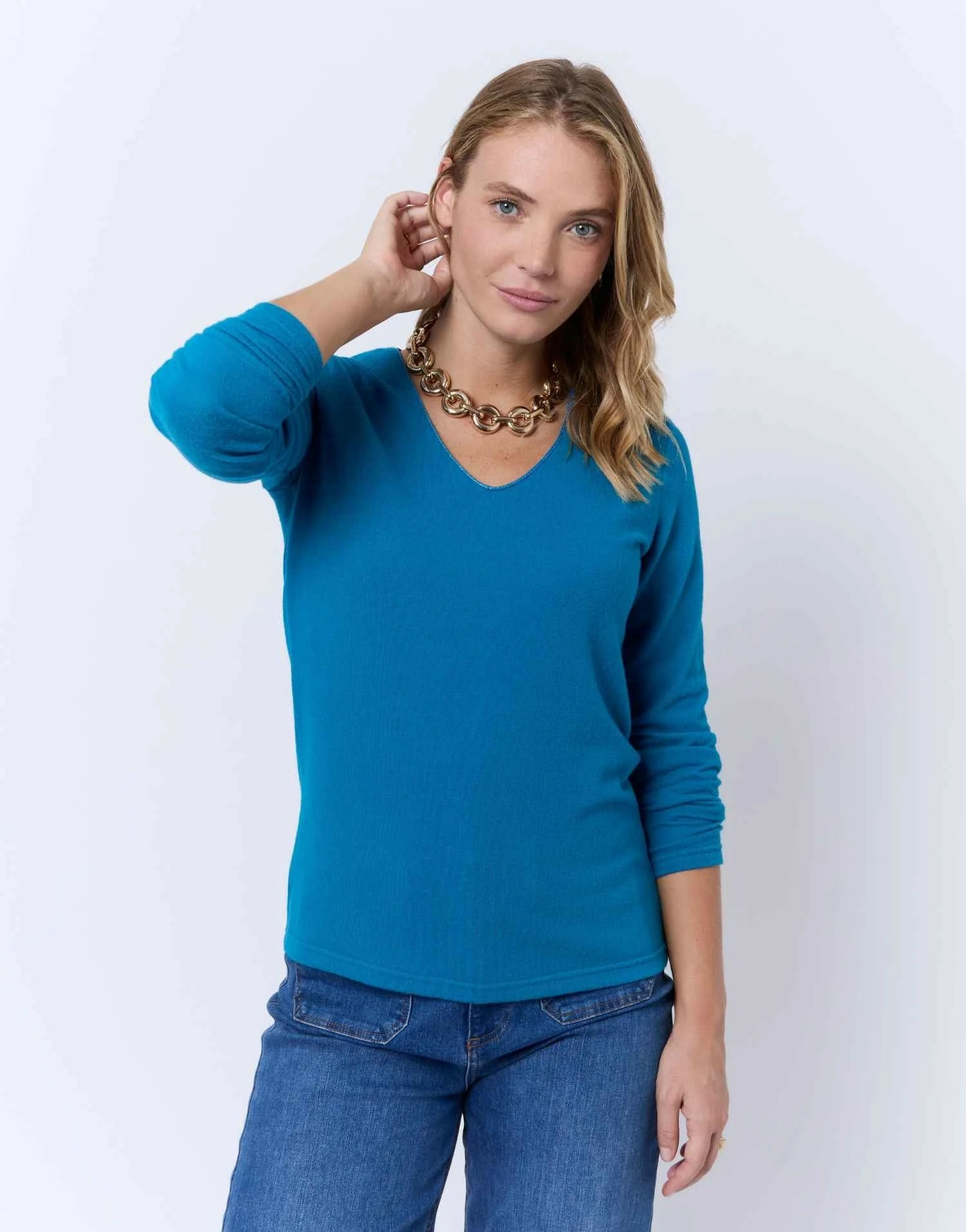 Confectionné en maille douce, ce t-shirt dévoile un décolleté en V rehaussé d’un liseré pailleté, apportant une note lumineuse sans excès. Sa coupe ajustée épouse la silhouette avec finesse, tandis que sa teinte bleu canard profonde s’accorde facilement avec vos bas préférés. Portez-le seul pour un look raffiné ou en superposition pour plus de chaleur et de style.