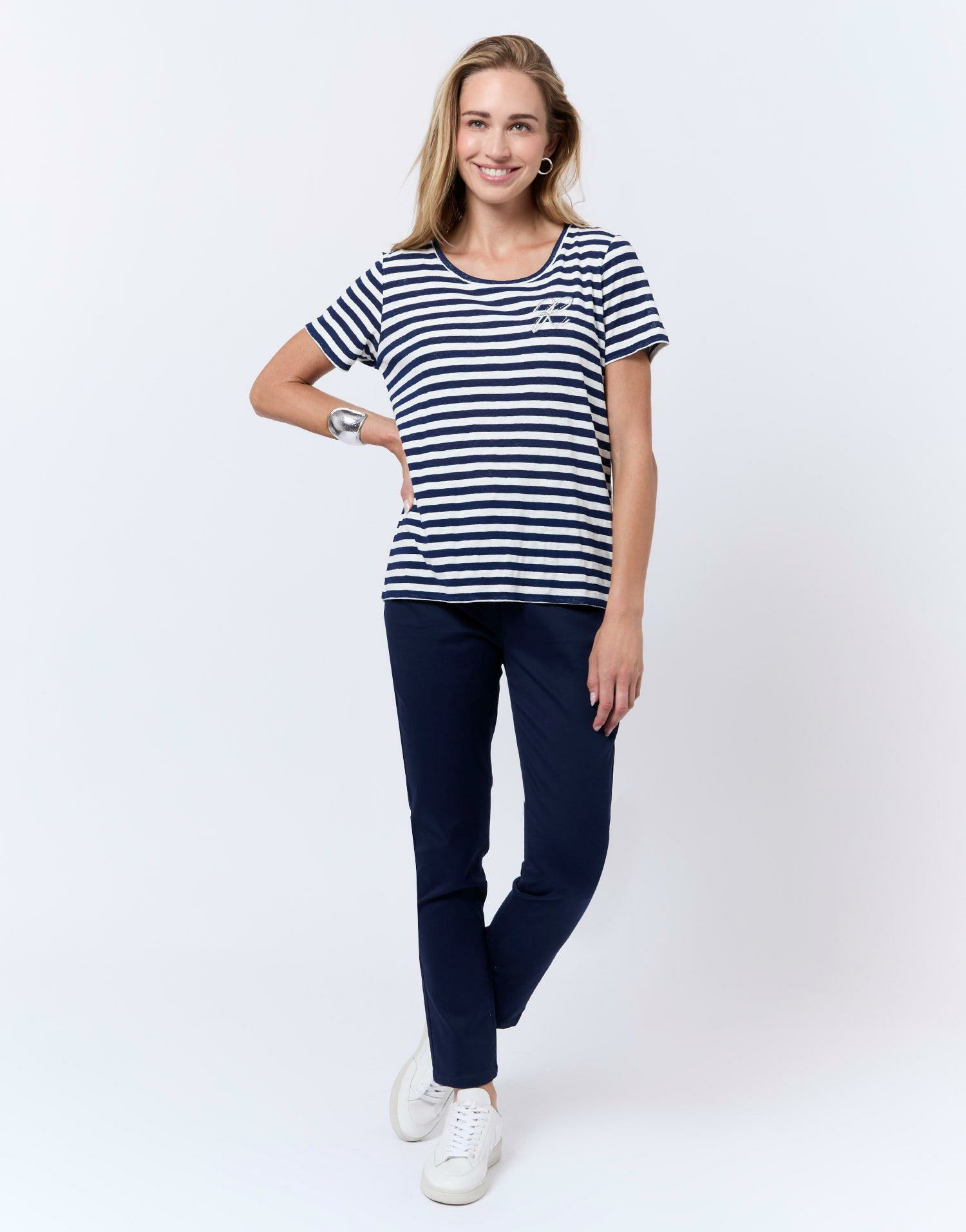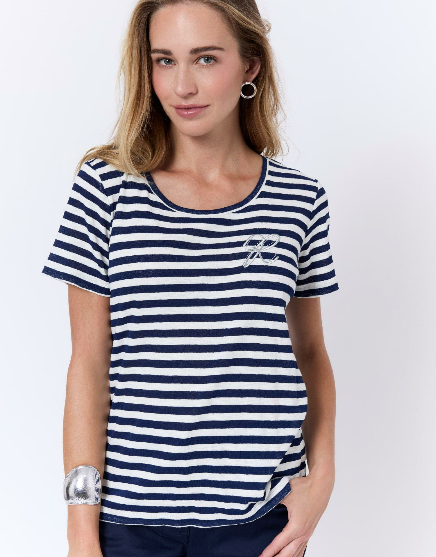 Matière : mélange coton rayé marine. Coupe ajustée. Manches courtes. Broderie argentée discrète sur le devant. Gilda mesure 1m75 et porte une taille 1.