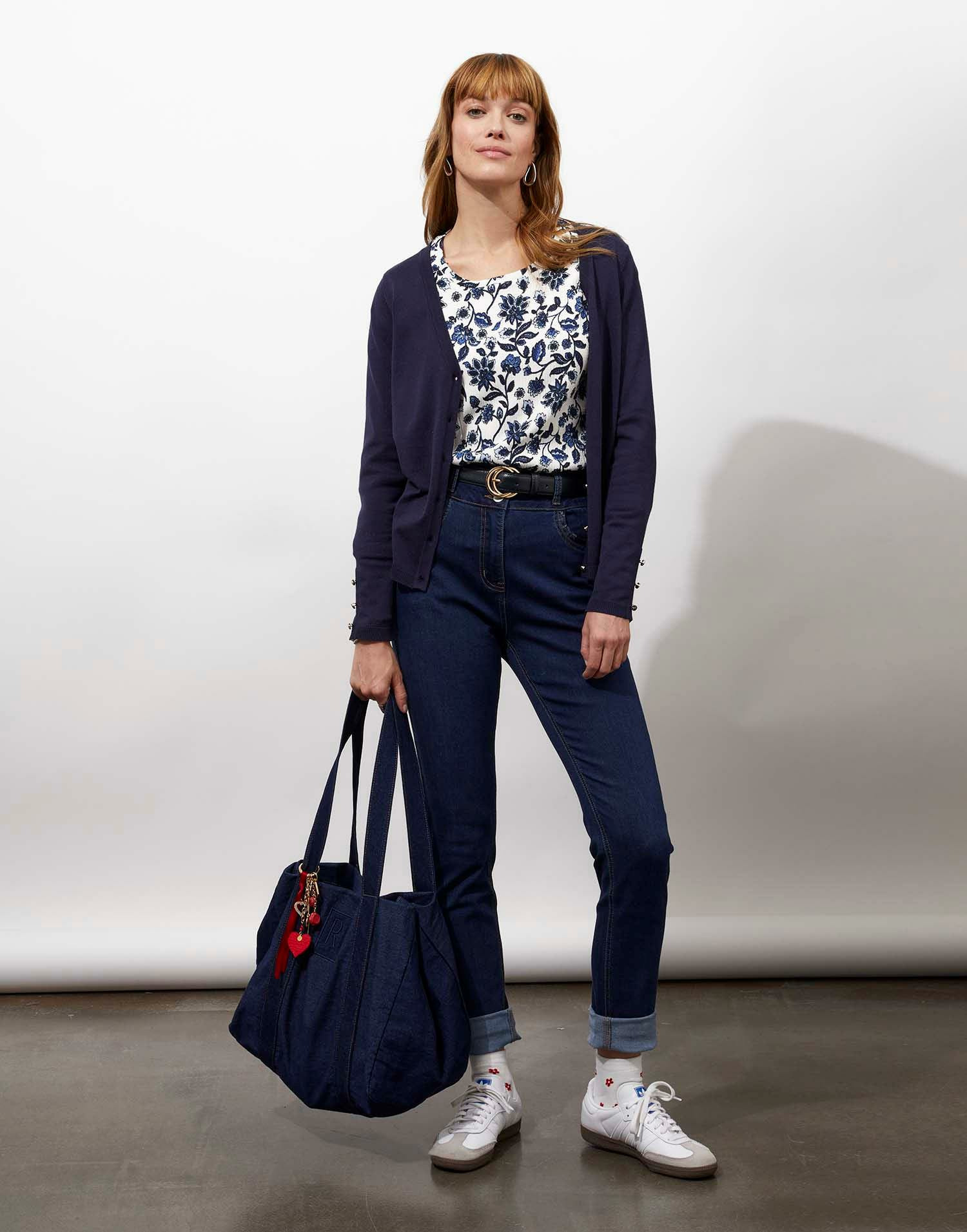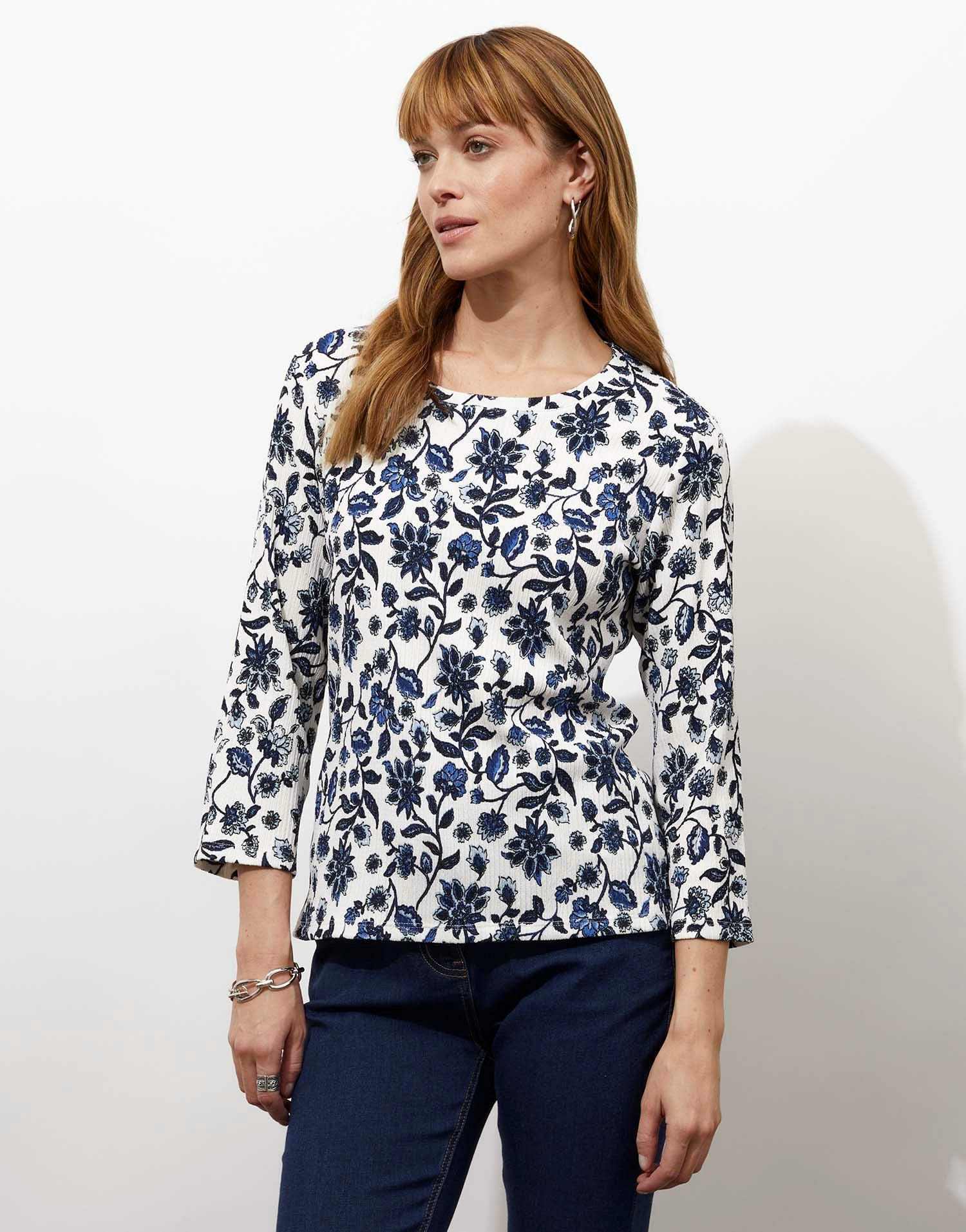 Maille gaufrée légère, manches trois-quarts, encolure arrondie, imprimé fleuri. La mannequin mesure 1m75 et porte une taille 01.
