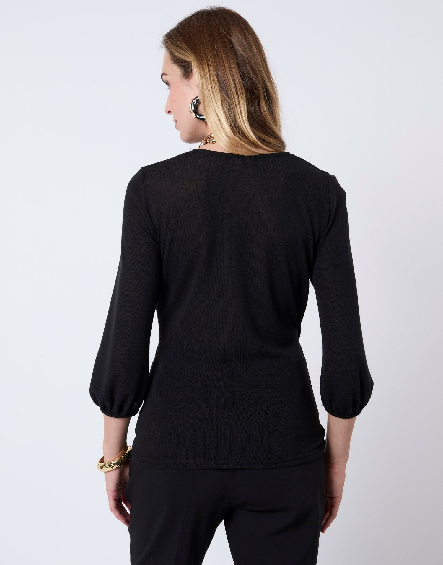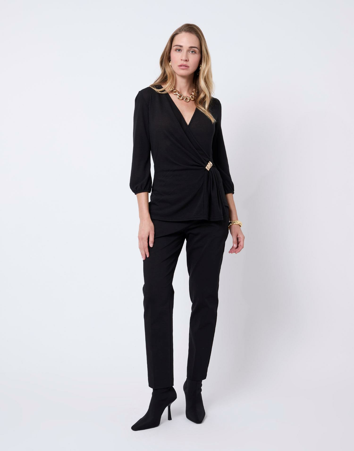 Affirmez votre élégance avec ce top manches 3/4 noir, une pièce essentielle pour sublimer votre silhouette en toute simplicité. Son design cache-cœur et son bijou doré apportent une touche sophistiquée à votre tenue.