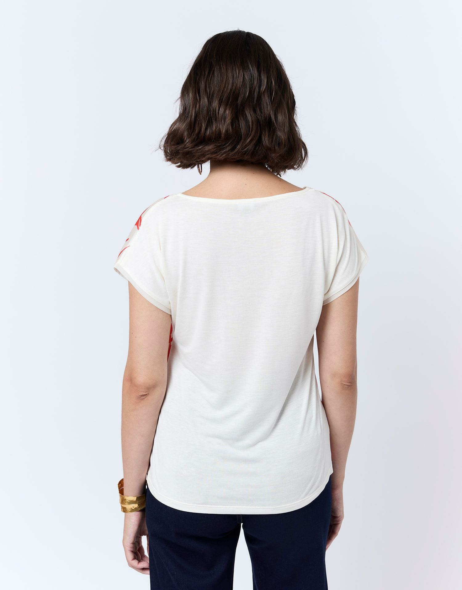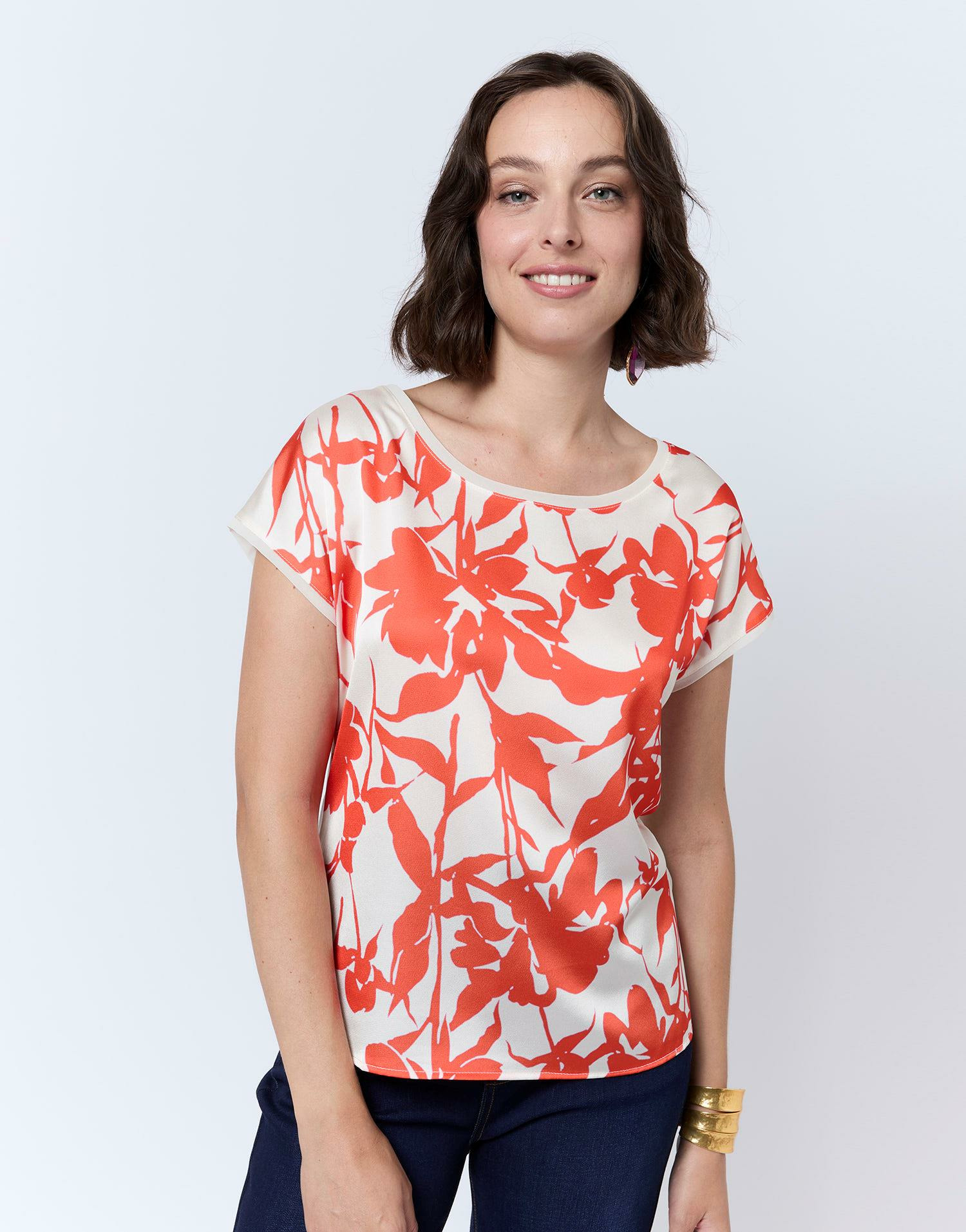 Ce top combine élégance et originalité grâce à son jeu de matières subtilement contrastées. L’imprimé floral orange éclatant capte le regard tandis que l’encolure arrondie et les manches courtes offrent une coupe féminine et légère, parfaite pour les journées ensoleillées ou les soirées décontractées. Manon, qui mesure 1m75, porte une taille 1, illustrant parfaitement la fluidité et le confort de ce modèle.
