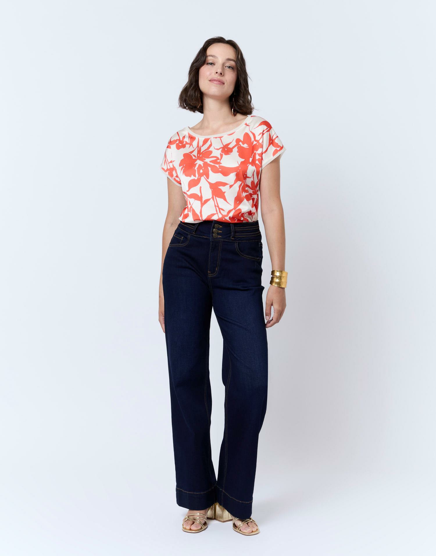 Ce top est signé RIU Paris, reconnu pour la qualité de ses finitions et son sens du détail. Il présente une encolure arrondie, des manches courtes et un imprimé floral orange vif sur un tissu bi-matière soigneusement sélectionné pour allier style et confort. Manon porte une taille 1, correspondant à une taille standard.