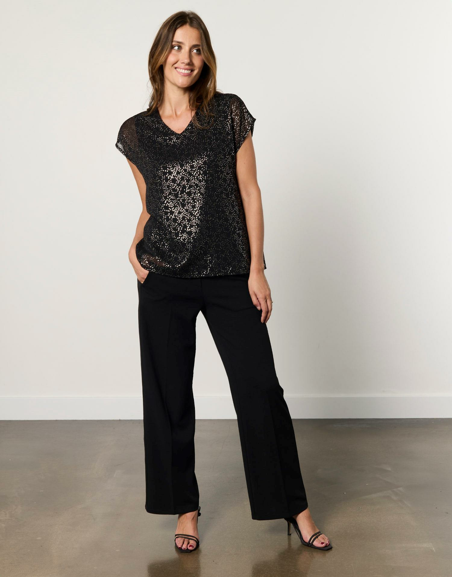 Portez-le pour illuminer vos soirées et attirer tous les regards. Ce top est facile à associer avec un pantalon tailleur ou une jupe élégante, vous assurant un style à la fois chic et audacieux. Son effet bi-matière garantit une tenue légère et agréable à porter, même lors des longues nuits festives.