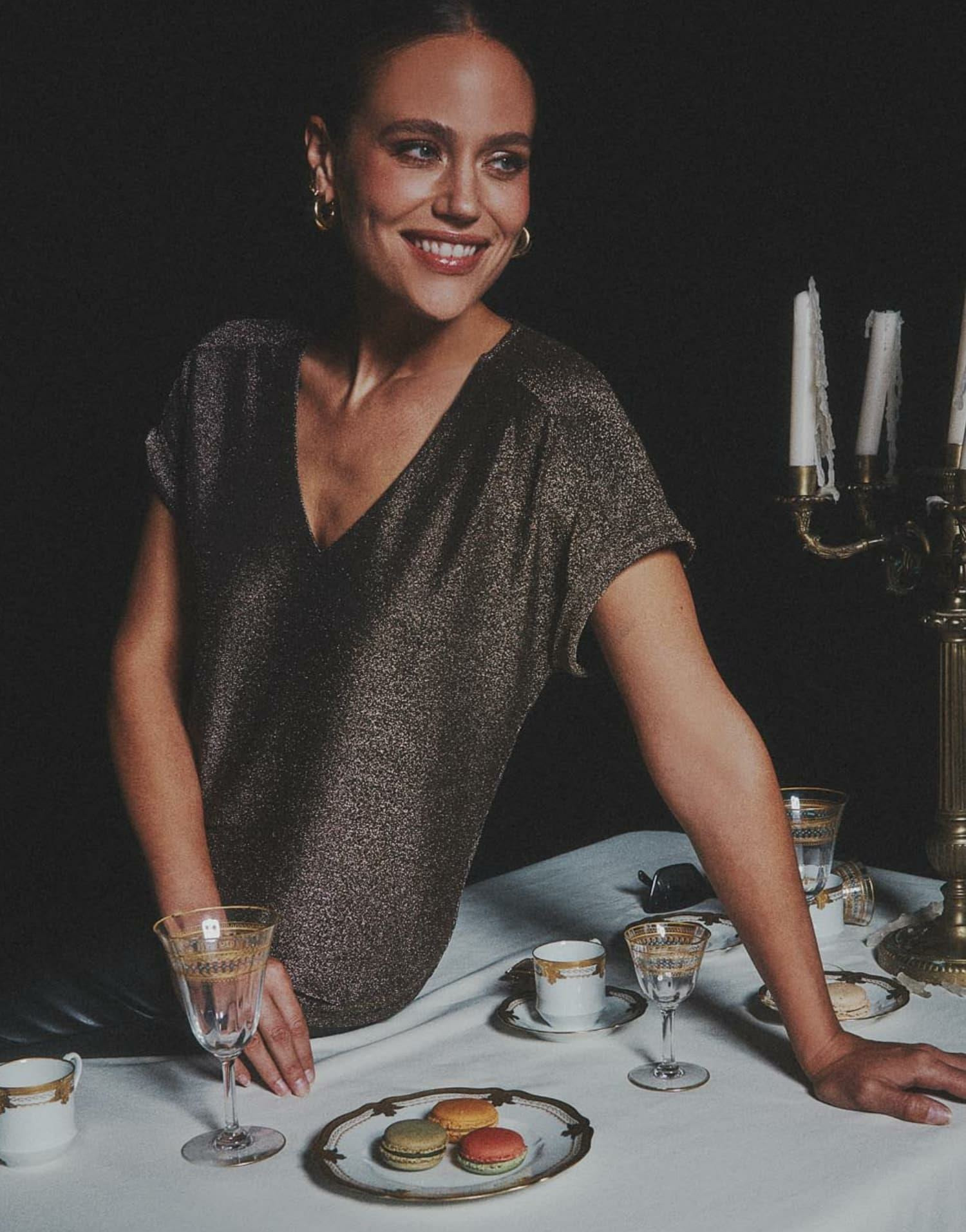 Manches courtes, coupe ajustée, tissu lamé brillant. Armelle mesure 1m79 et porte une taille 01. Disponible en plusieurs tailles pour convenir à toutes les morphologies.