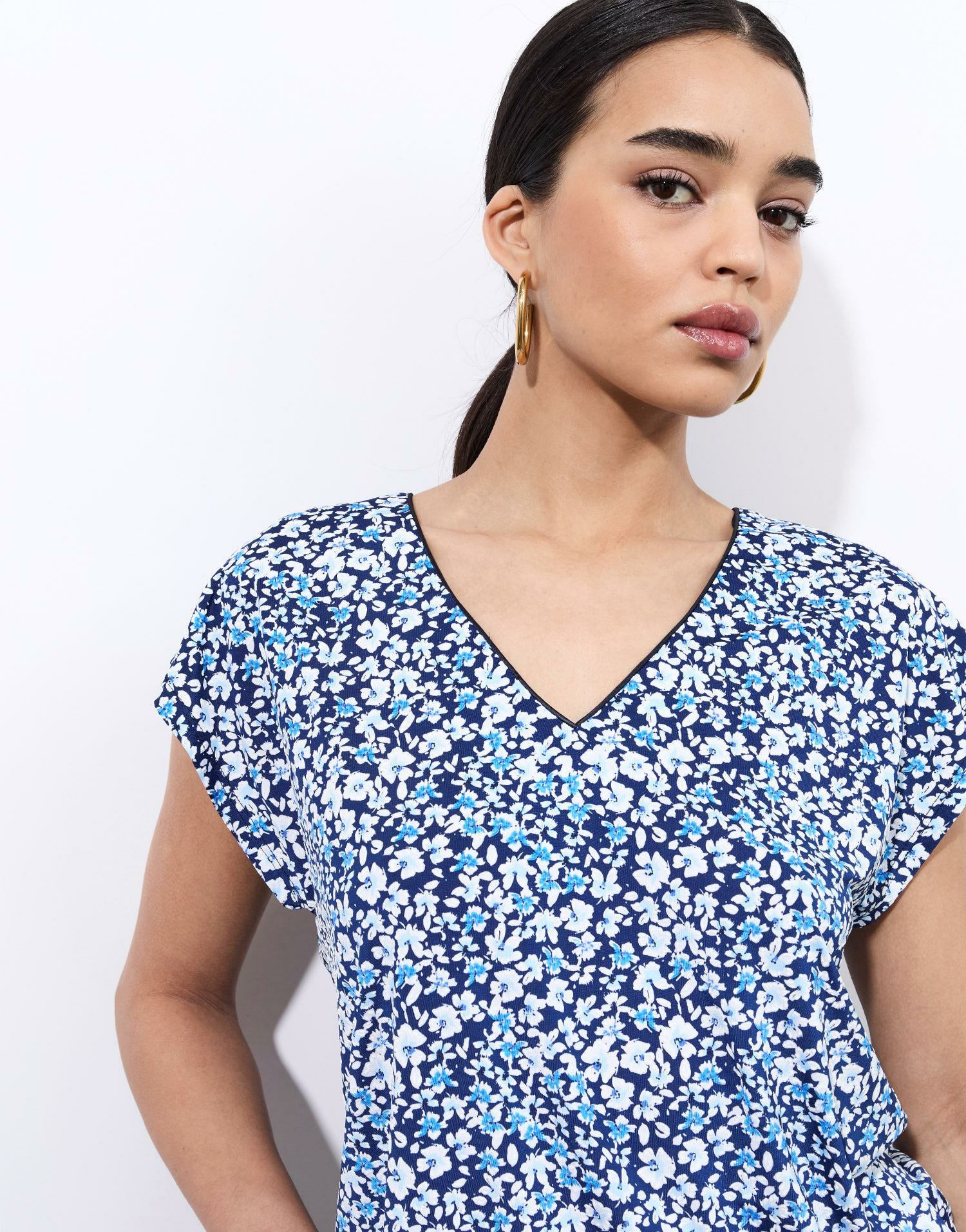 Blouse à la coupe fluide, imprimé floral bleu délicat, encolure en V, manches courtes. La mannequin mesure 1m75 et porte une taille 01.