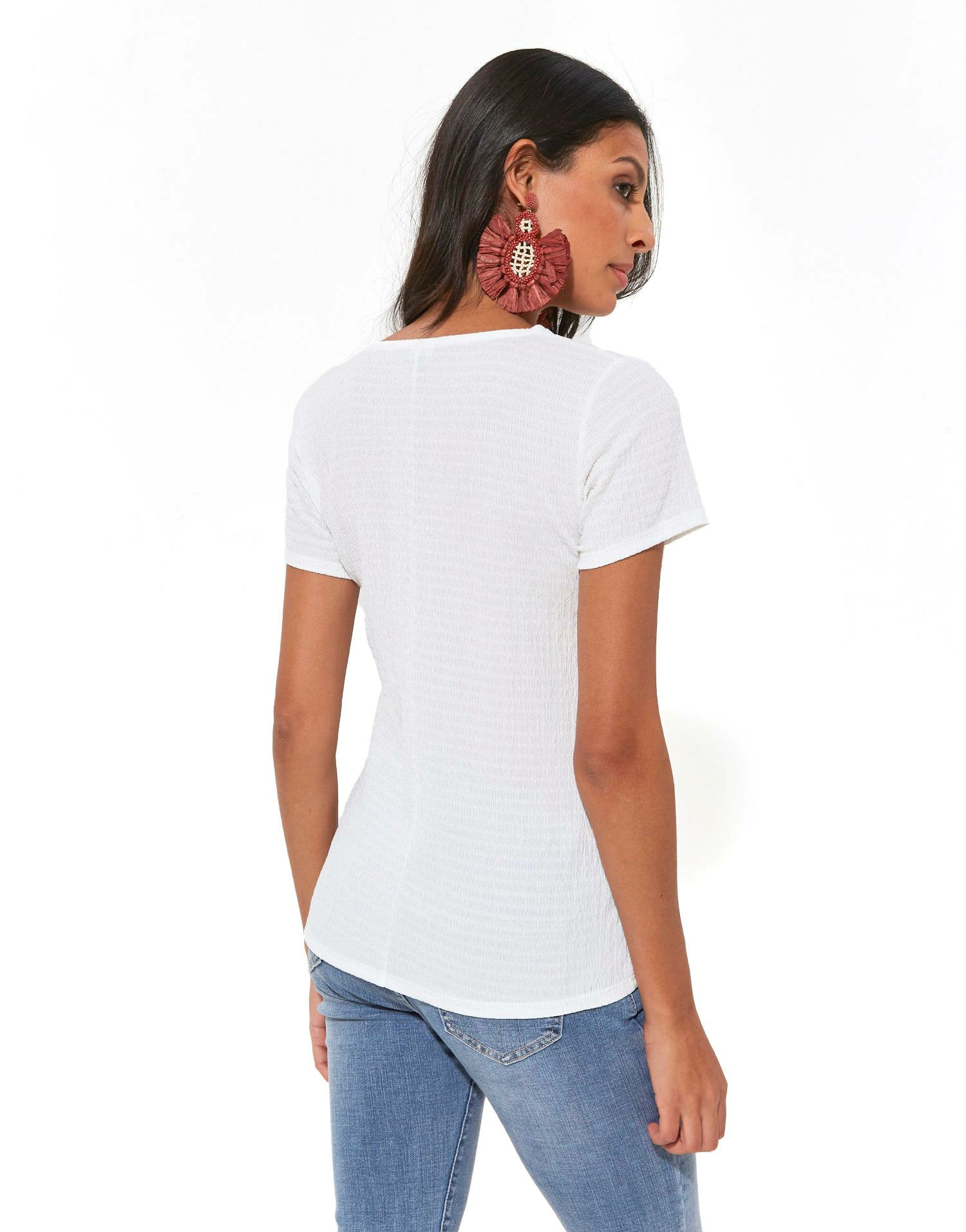 Un basique réinventé pour sublimer votre quotidien. Ce top manches courtes blanc incarne l’élégance simple et la polyvalence moderne.
