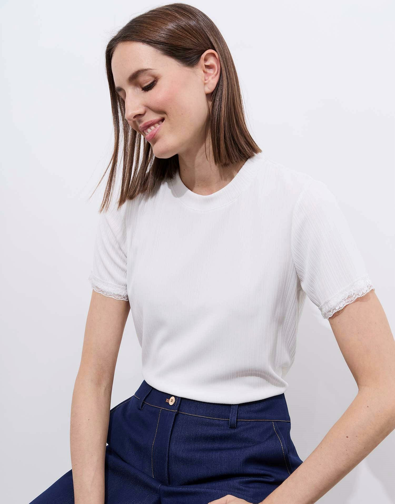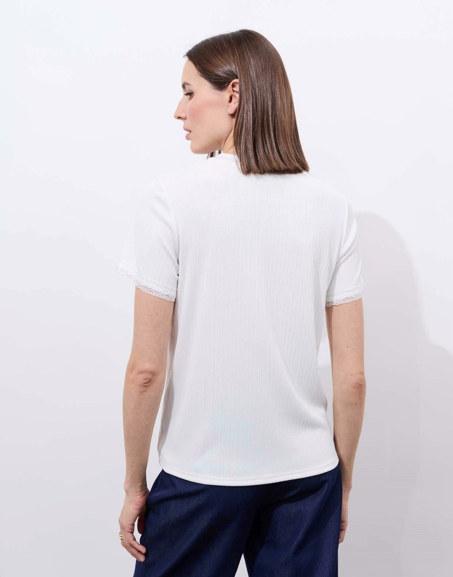 Mannequin mesurant 1m75 portant une taille 01. Top à manches courtes, coupe droite, col montant, détail en dentelle. Coloris uni ecru. Marque RIU Paris.