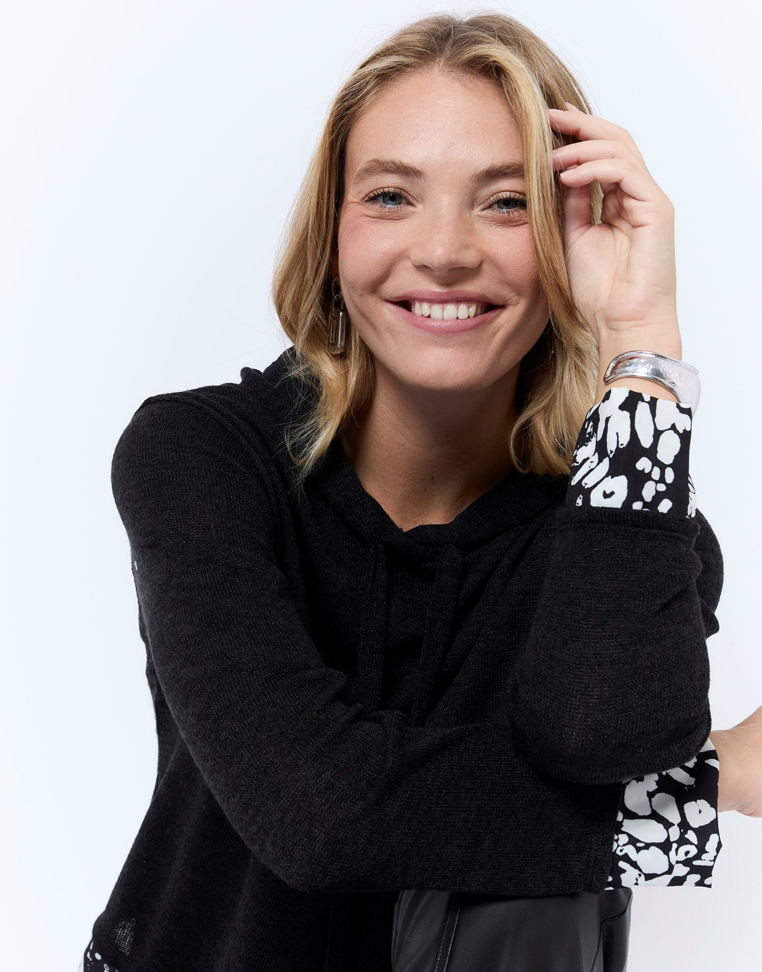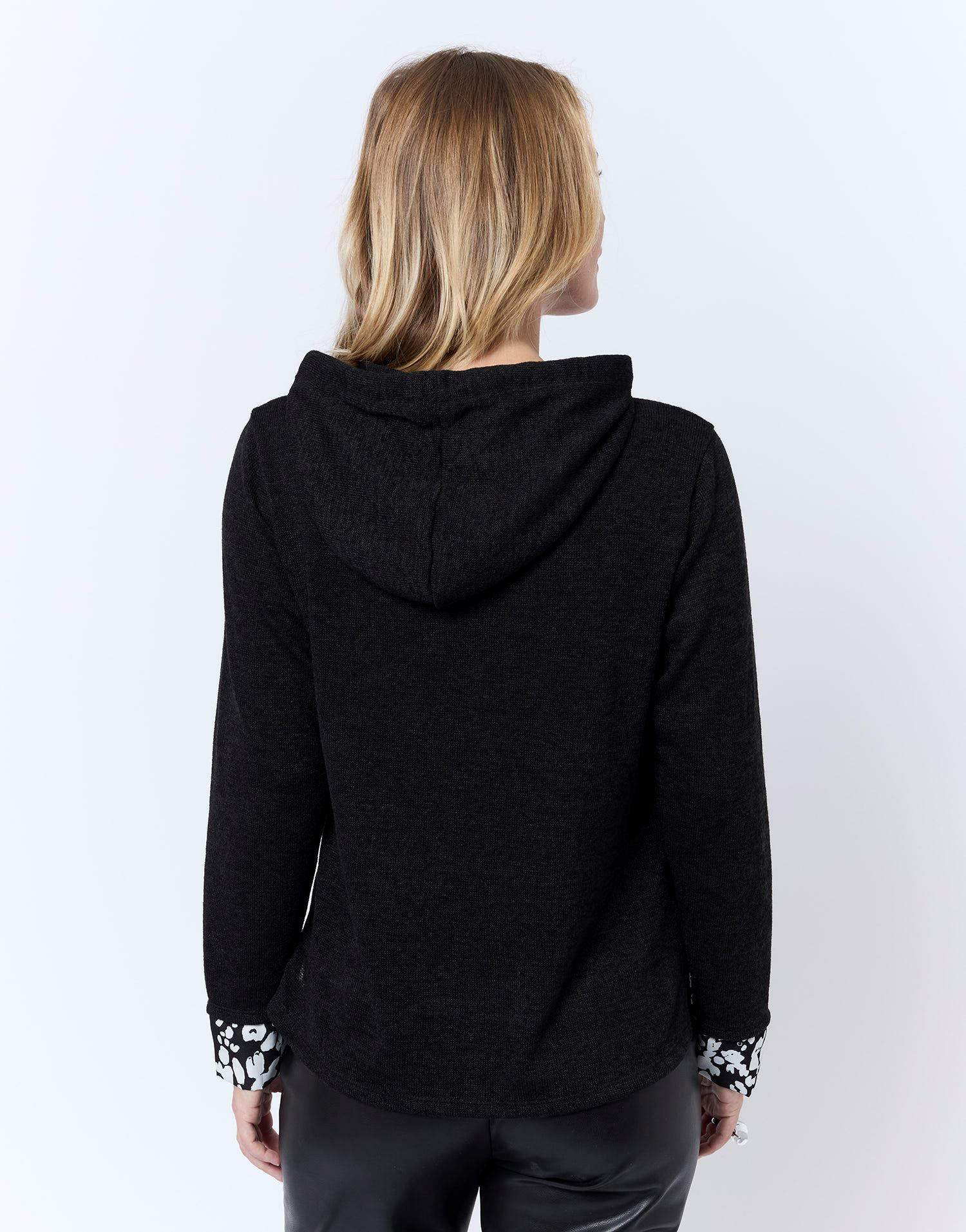Top manches longues uni noir, col capuche, empiècement fantaisie. Coupe droite, manches longues, matière confortable. Karen mesure 1m74 et porte une taille 1.
