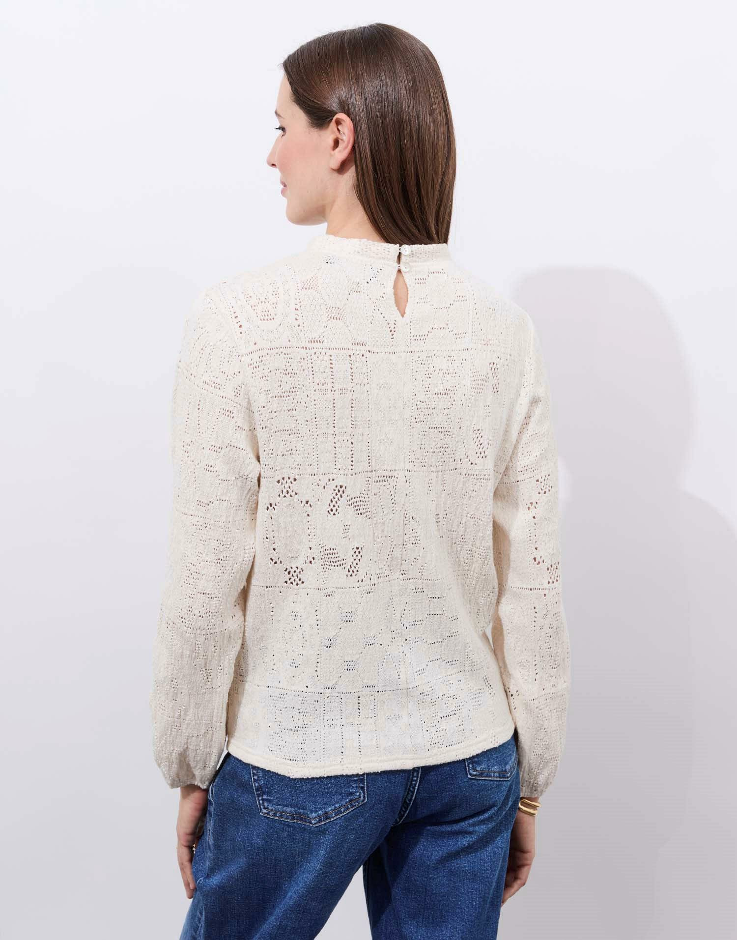 T-shirt uni à manches longues, encolure arrondie, maille légère avec jeu de mailles ajourées. La mannequin mesure 1m75 et porte une taille 01. Disponible en écru.