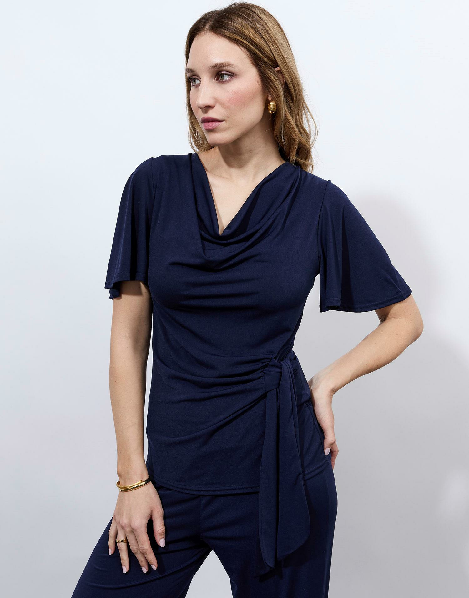 Top manches papillon uni marine, encolure bénitier avec drapé, lien à nouer sur le côté, coupe fluide. La mannequin mesure 1m75 et porte une taille 01.