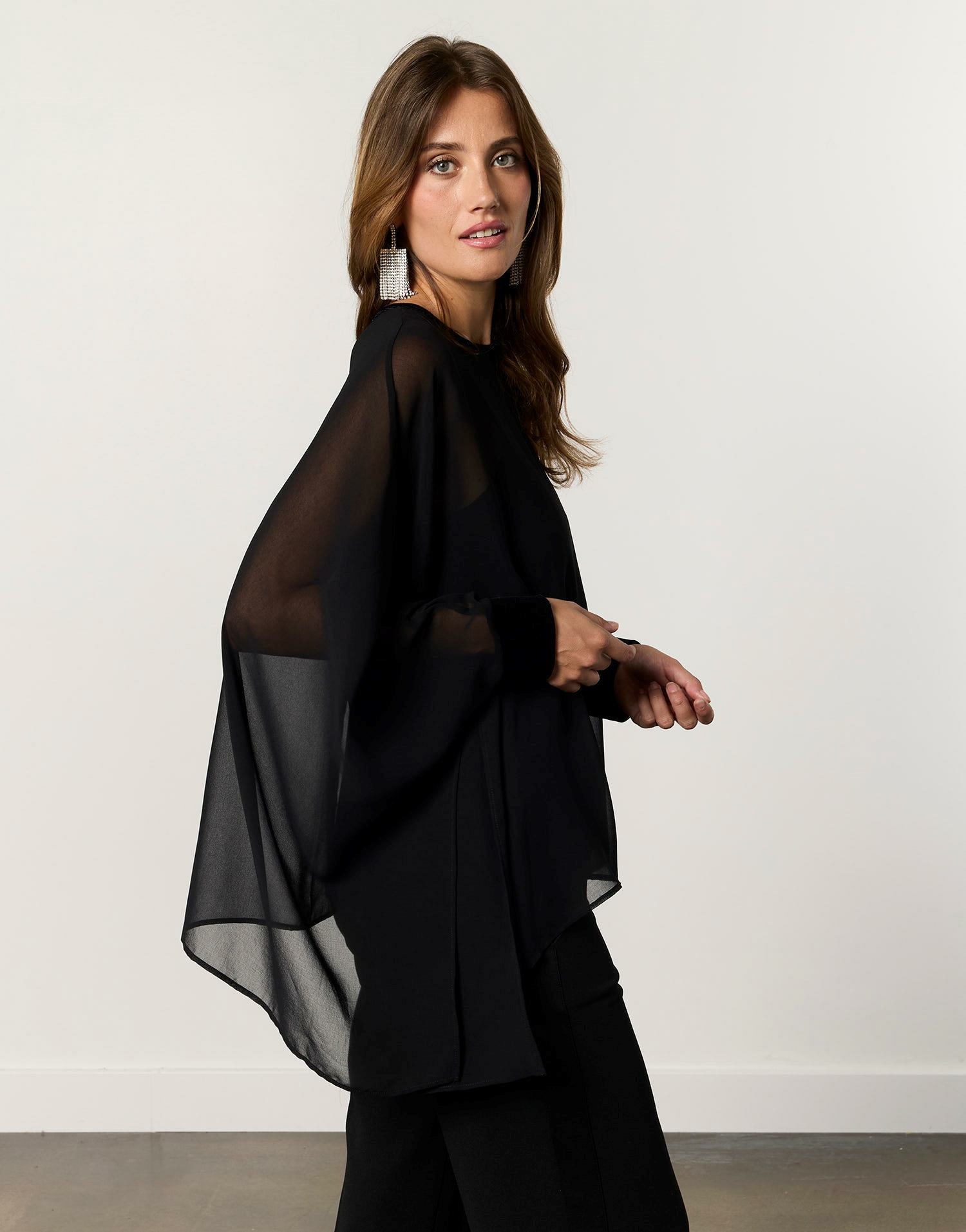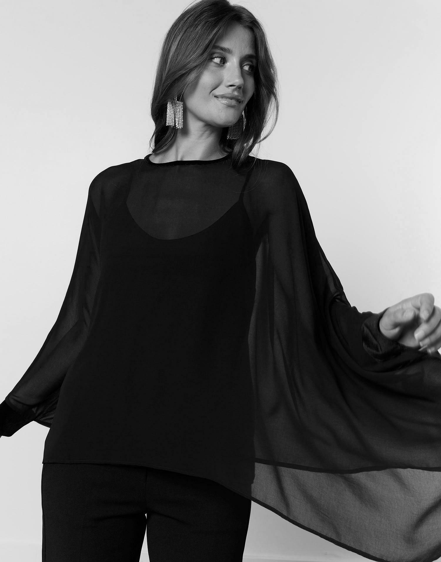 Sublimez vos soirées avec cette tunique noire aux manches chauve-souris, alliant élégance et modernité. Un voile délicat qui joue avec la lumière pour un effet de transparence sophistiqué.