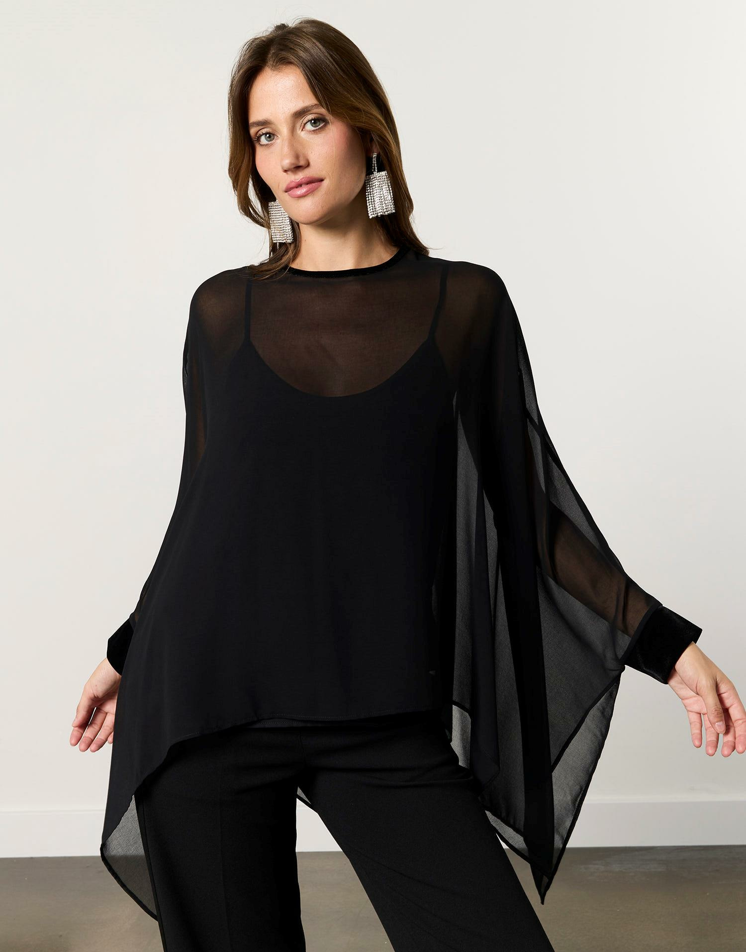 Voile noir transparent à manches chauve-souris, débardeur noir intégré, coupe ample. Armelle mesure 1m79 et porte une taille S.