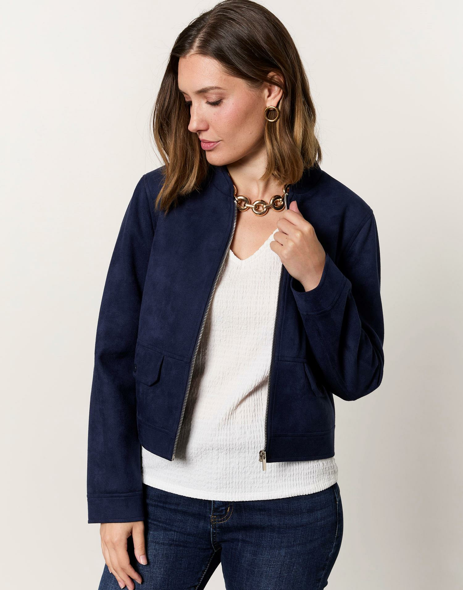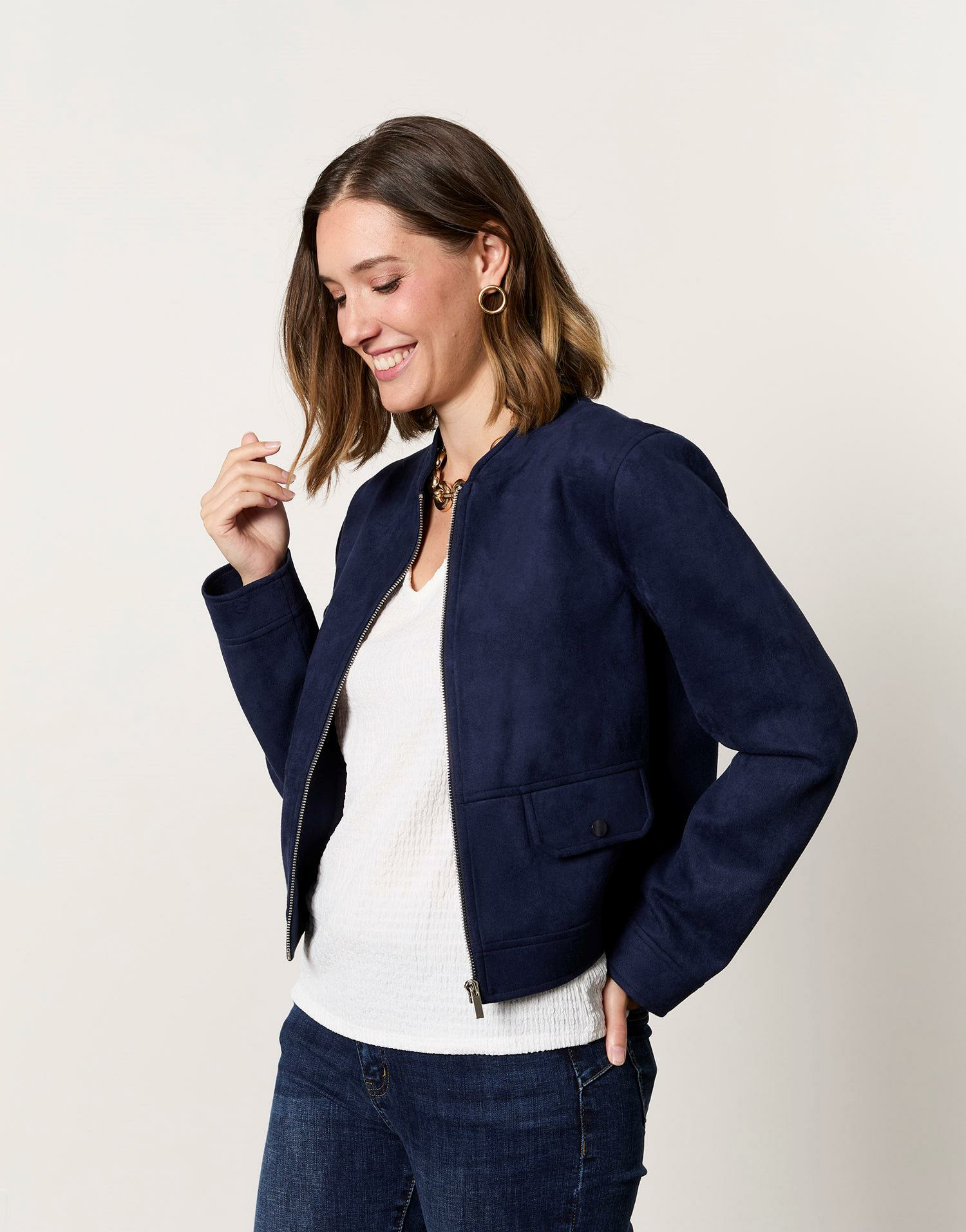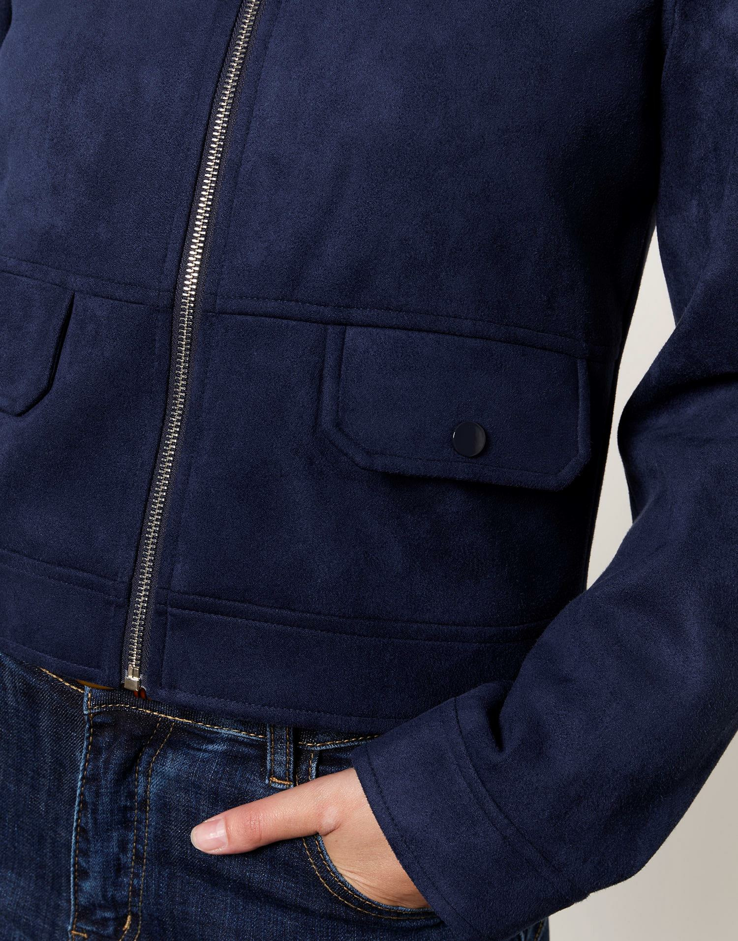 Adoptez une allure casual-chic avec la veste courte unie marine signée RIU Paris. Sa coupe teddy en suédine apporte une touche moderne et confortable à toutes vos tenues.