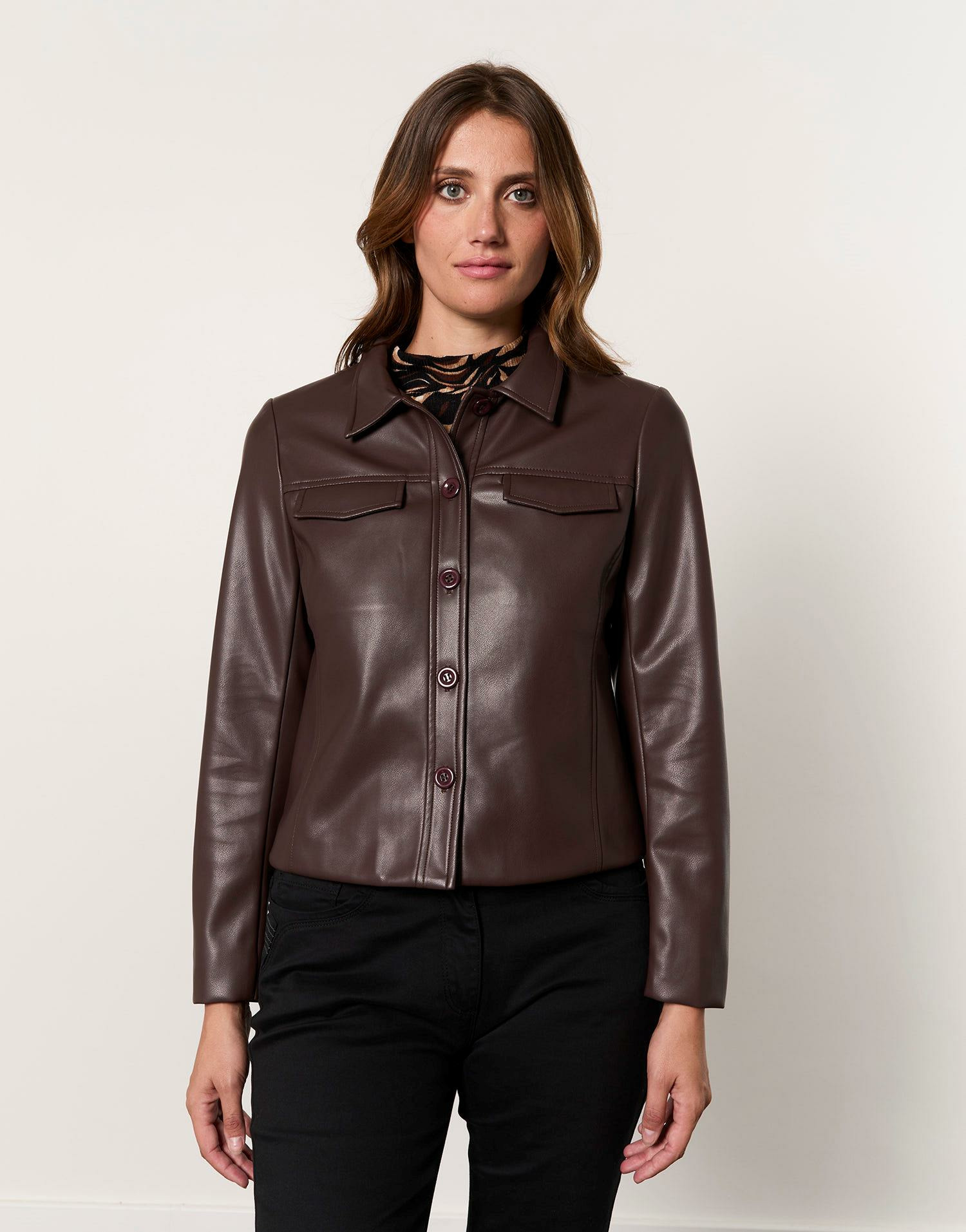 Fabriquée dans un similicuir de qualité, cette veste courte présente un col chemise classique et une fermeture discrète. Sa teinte marron unie garantit une grande facilité d’association avec vos pièces favorites. Armelle mesure 1m79 et porte une taille 38 pour un rendu parfaitement ajusté.