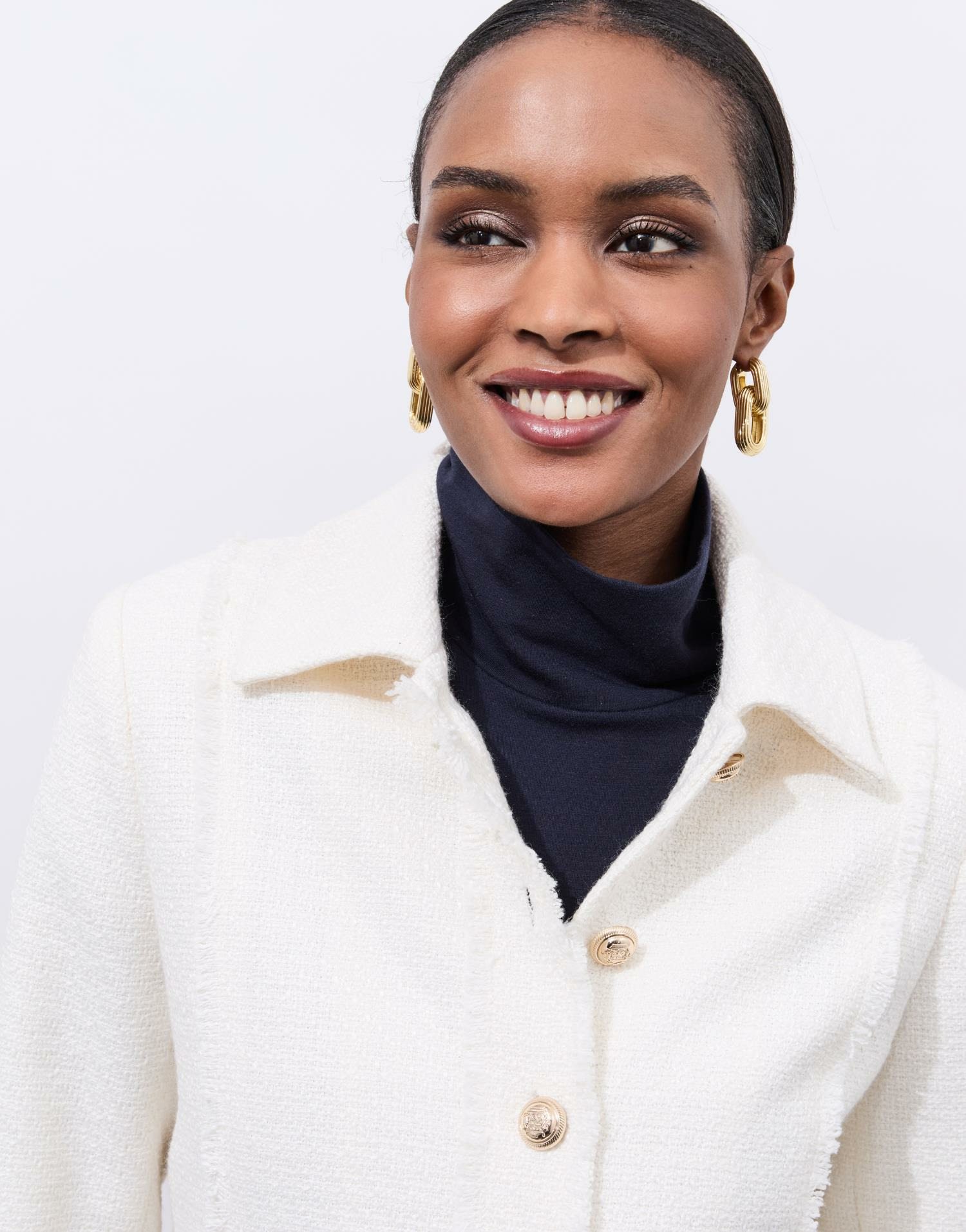 Veste courte en tweed ecru pour femme, manches longues, col simple, poches à rabat, boutons dorés fantaisie. La mannequin mesure 1m75 et porte une taille 38.