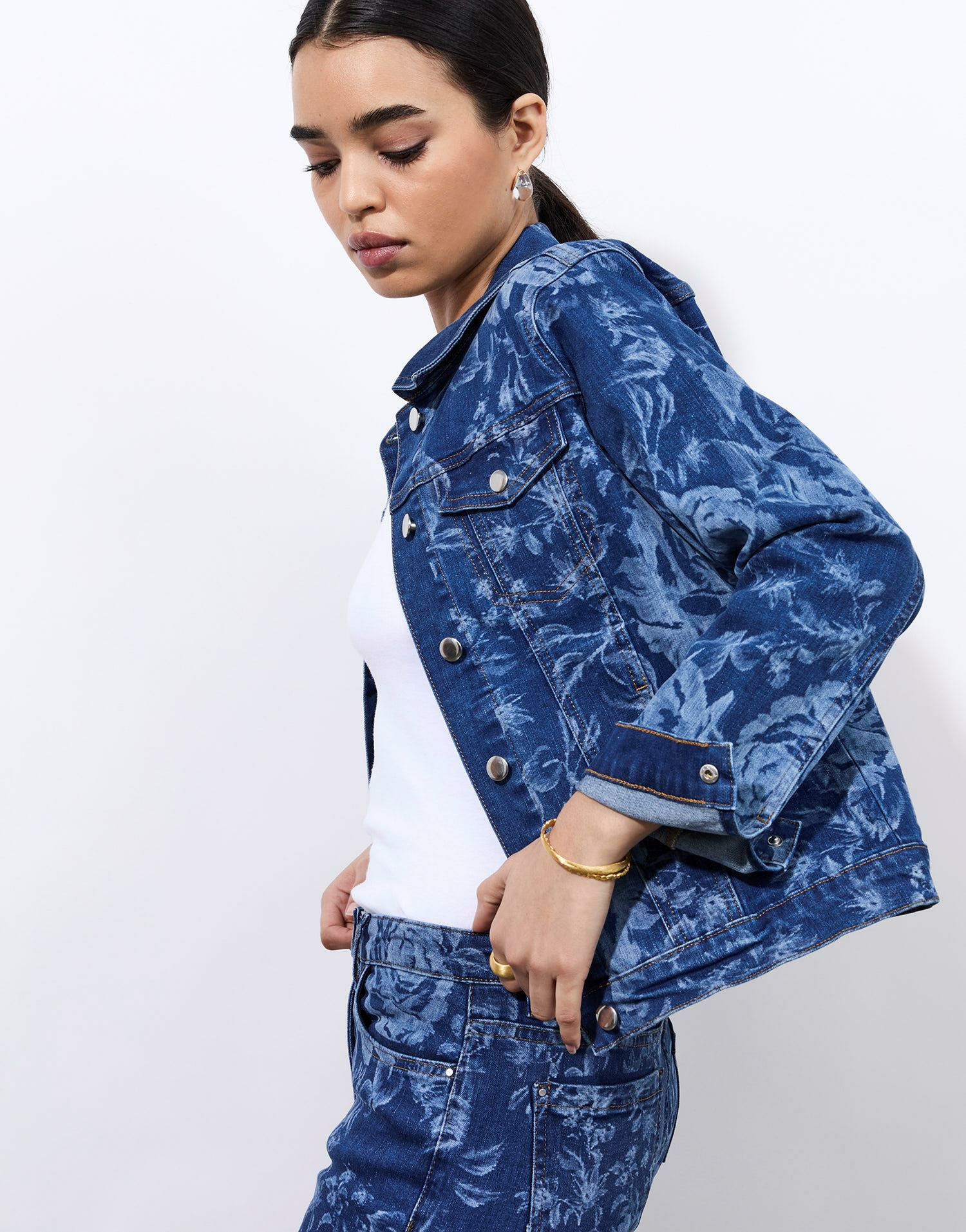 Affirmez votre style avec cette veste en denim imprimée, alliant modernité et élégance décontractée. Une pièce unique pour dynamiser vos tenues quotidiennes.