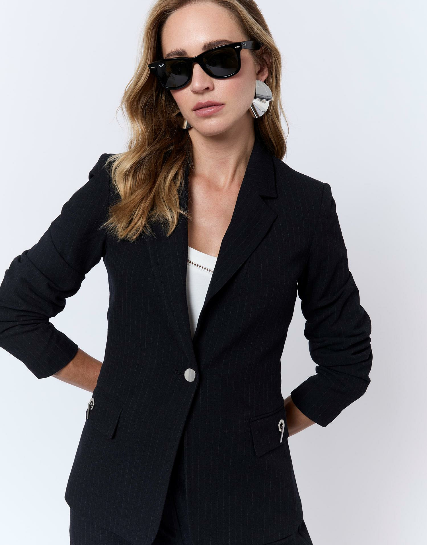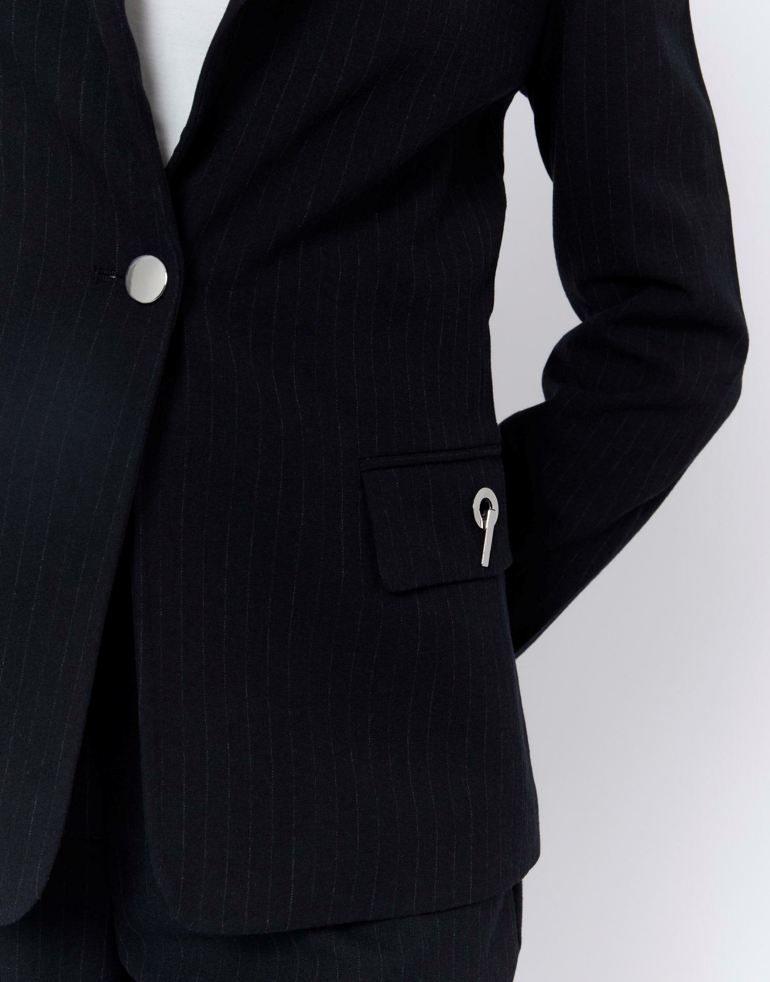 Confectionnée avec soin, elle présente un col tailleur classique, des fines rayures noires et une attache métallique sur la poche avant. Disponible en taille 38 portée par le modèle, elle s’inscrit dans une collection pensée pour un look tailleur moderne et soigné.