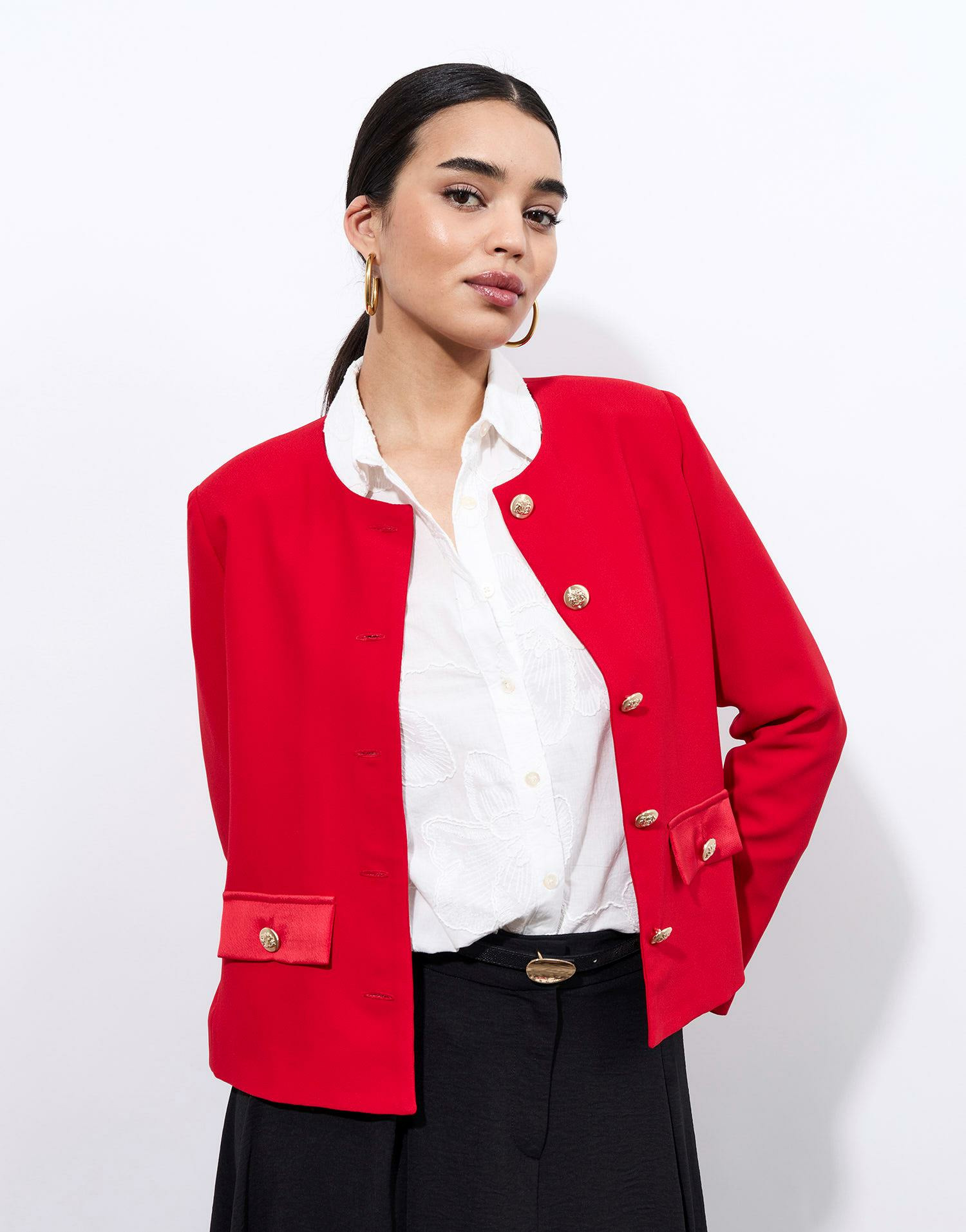 Affirmez votre style avec cette veste unie rouge signée RIU Paris, alliant élégance et modernité. Une pièce structurée qui sublime instantanément votre silhouette.