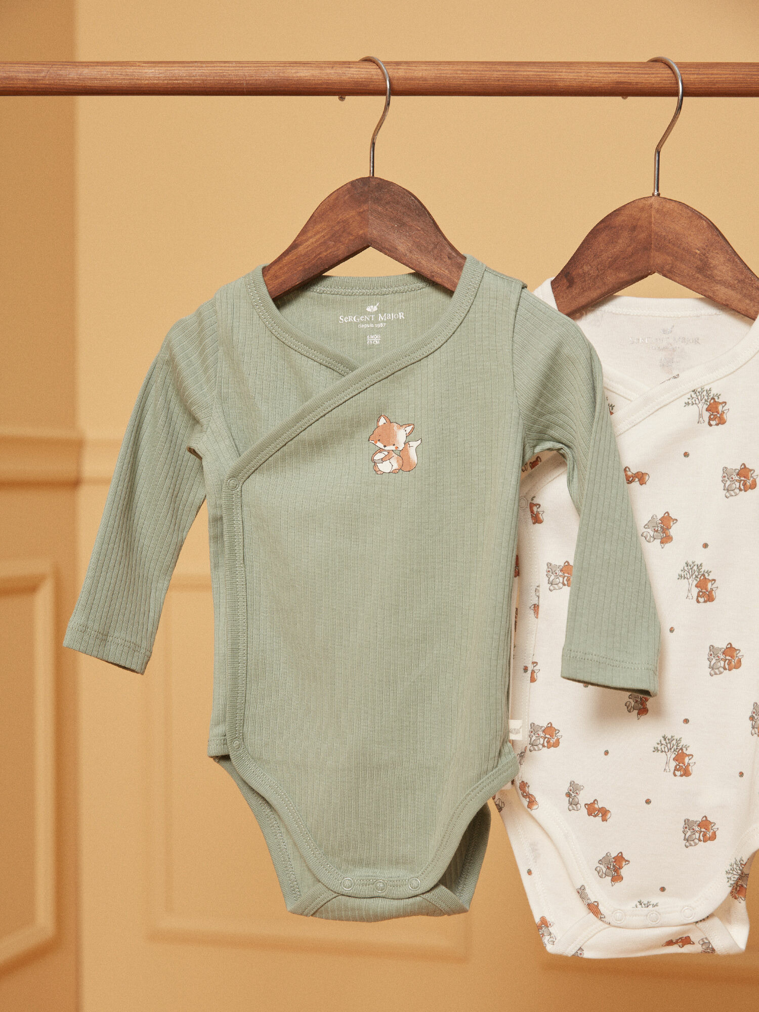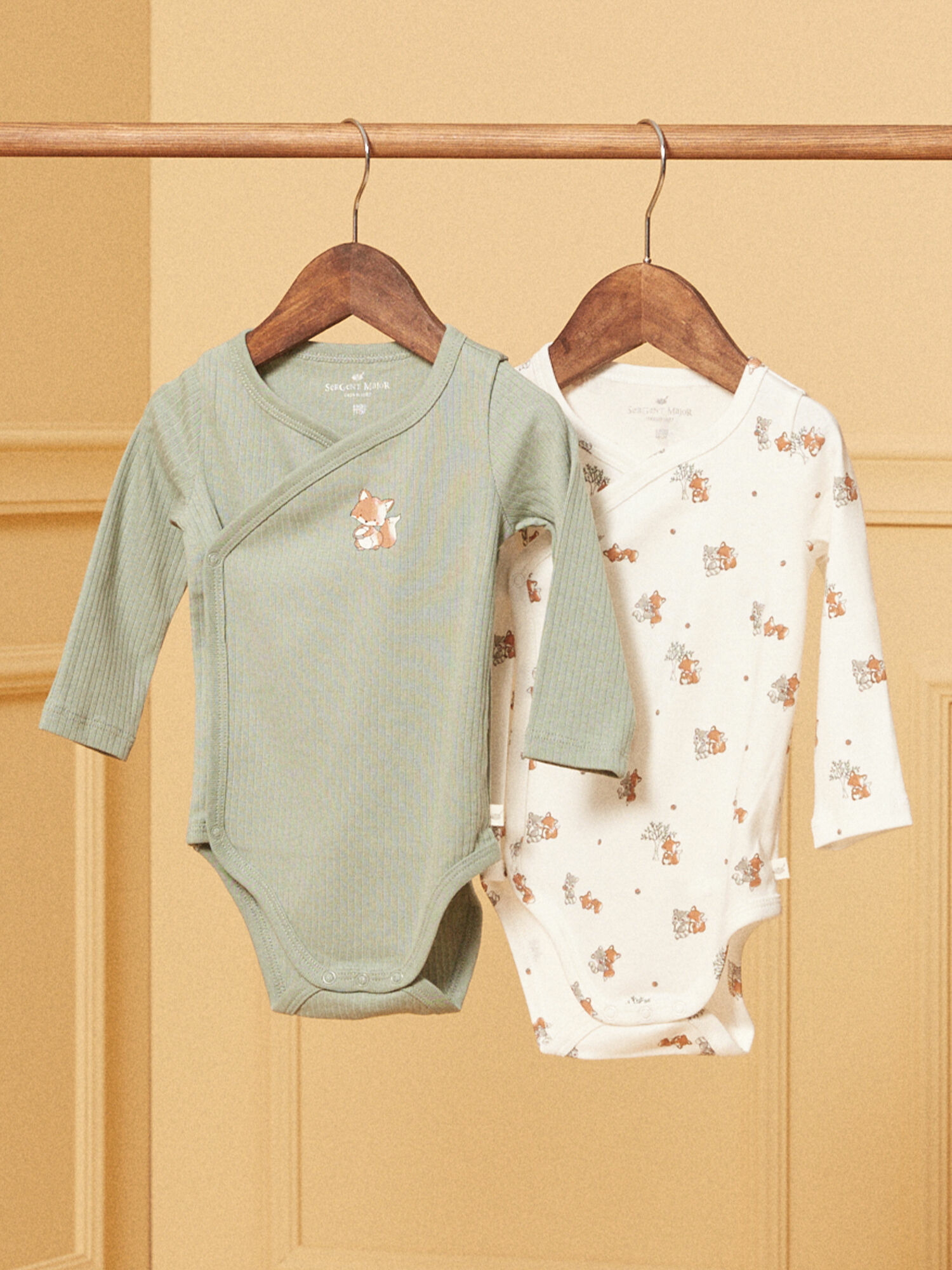 Offrez à votre bébé douceur et style avec ce duo de bodies en coton écru et kaki, aux motifs renard délicats. Un choix naturel et élégant pour les premiers jours.