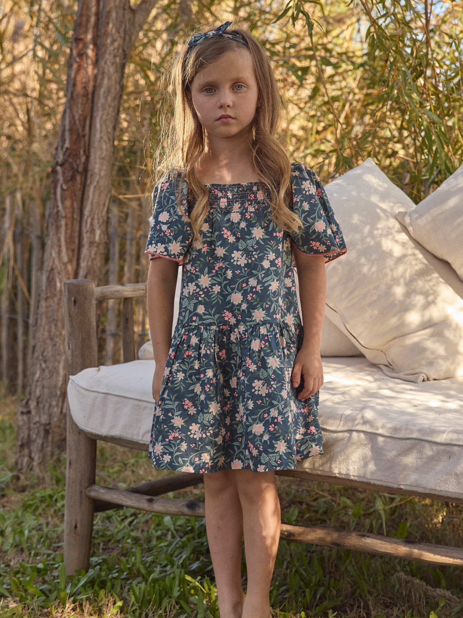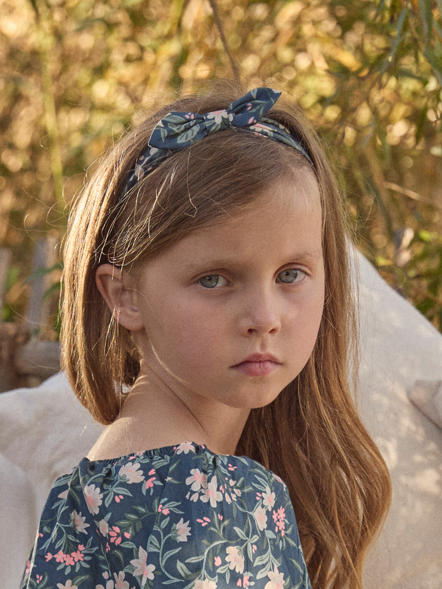 Apportez une touche de fraîcheur et de douceur à la coiffure de votre enfant avec ce bandeau à nœud imprimé fleuri. Son motif fleurs et feuillage sur fond bleu canard invite à la nature et à la légèreté.