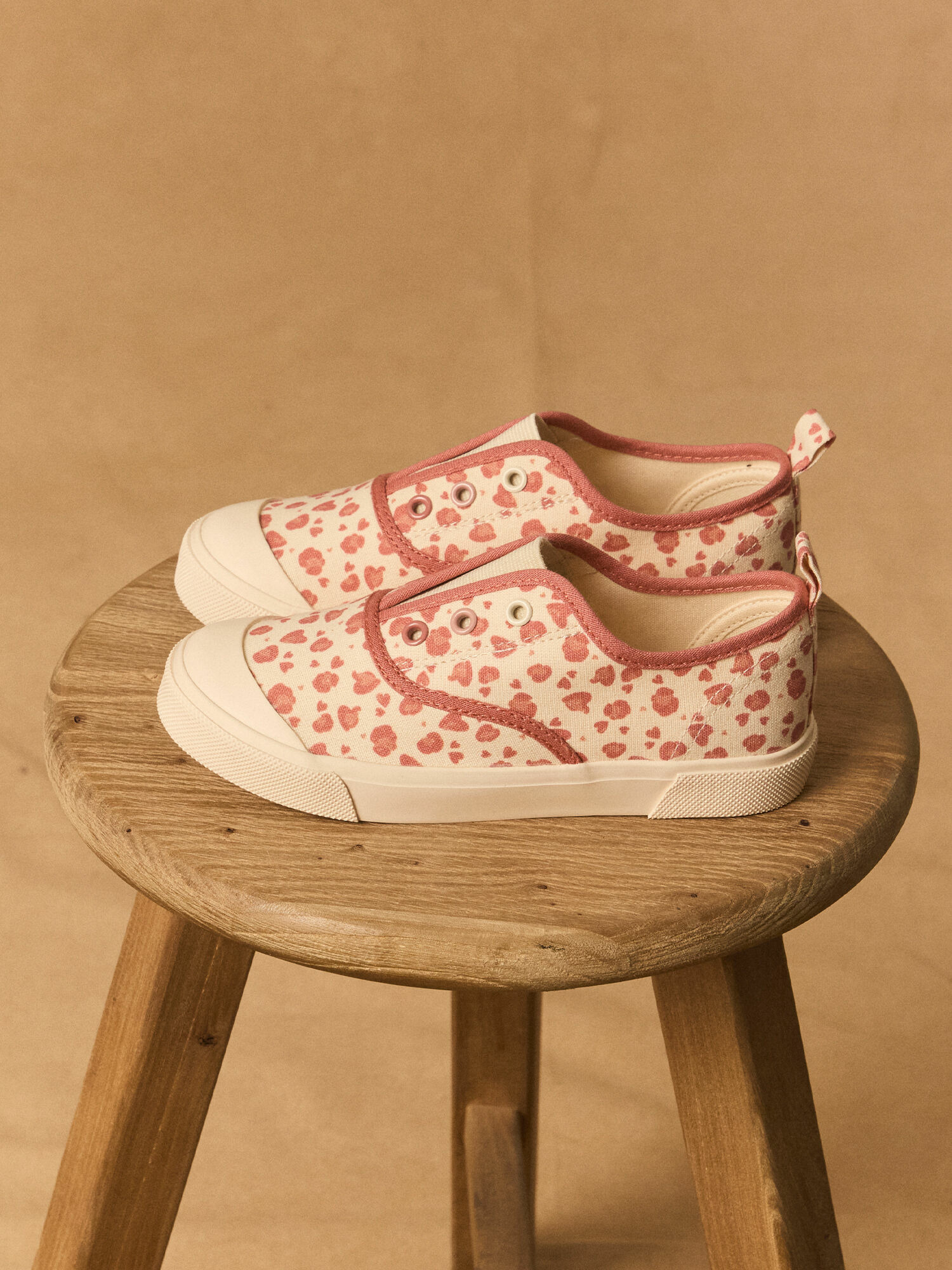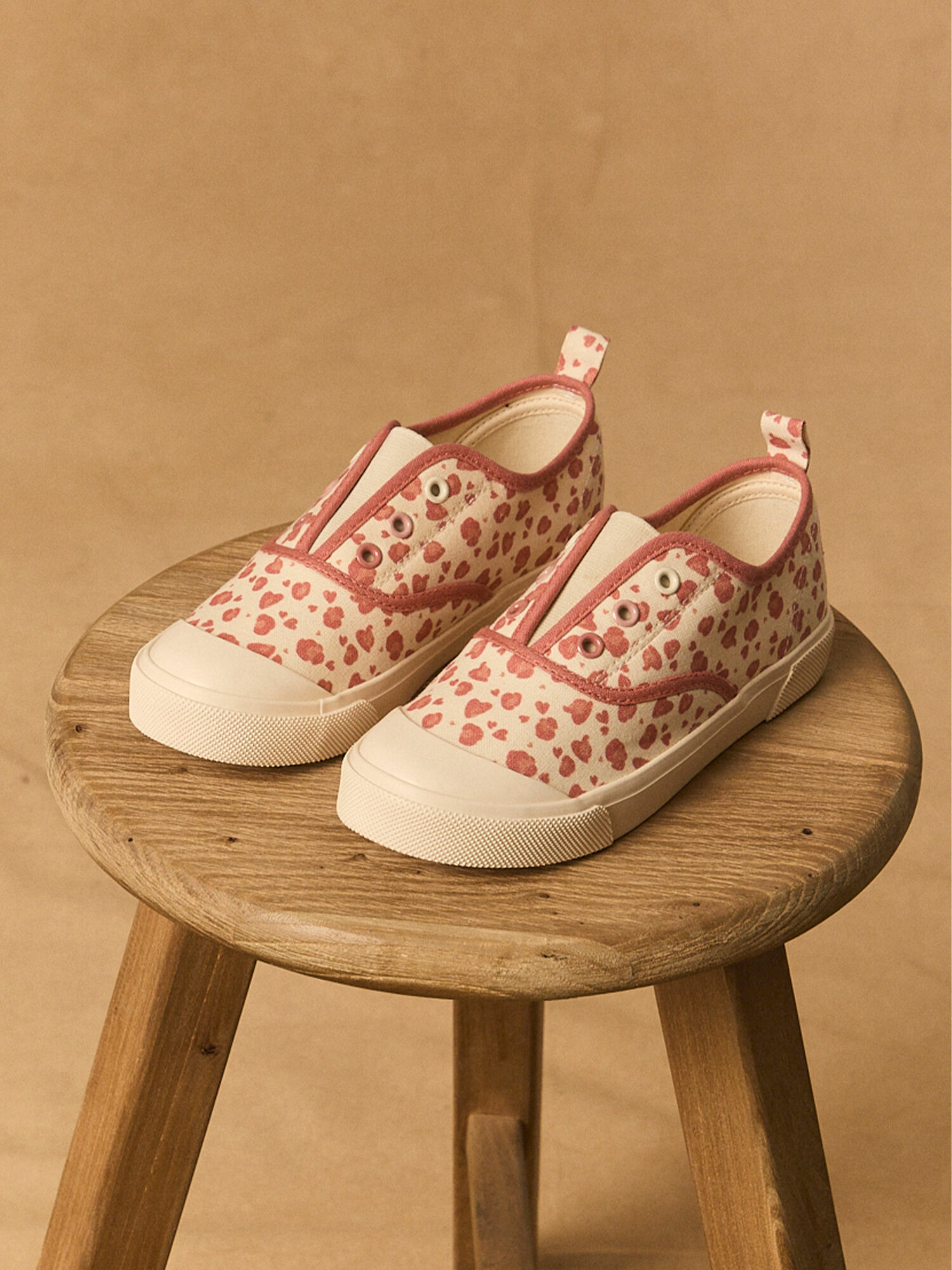 Fabriquées en toile imprimée léopard rose sur fond beige, elles disposent d’un élastique frontal et d’œillets décoratifs assortis. Le bout avant est renforcé pour plus de durabilité, et une languette arrière facilite l’enfilage.