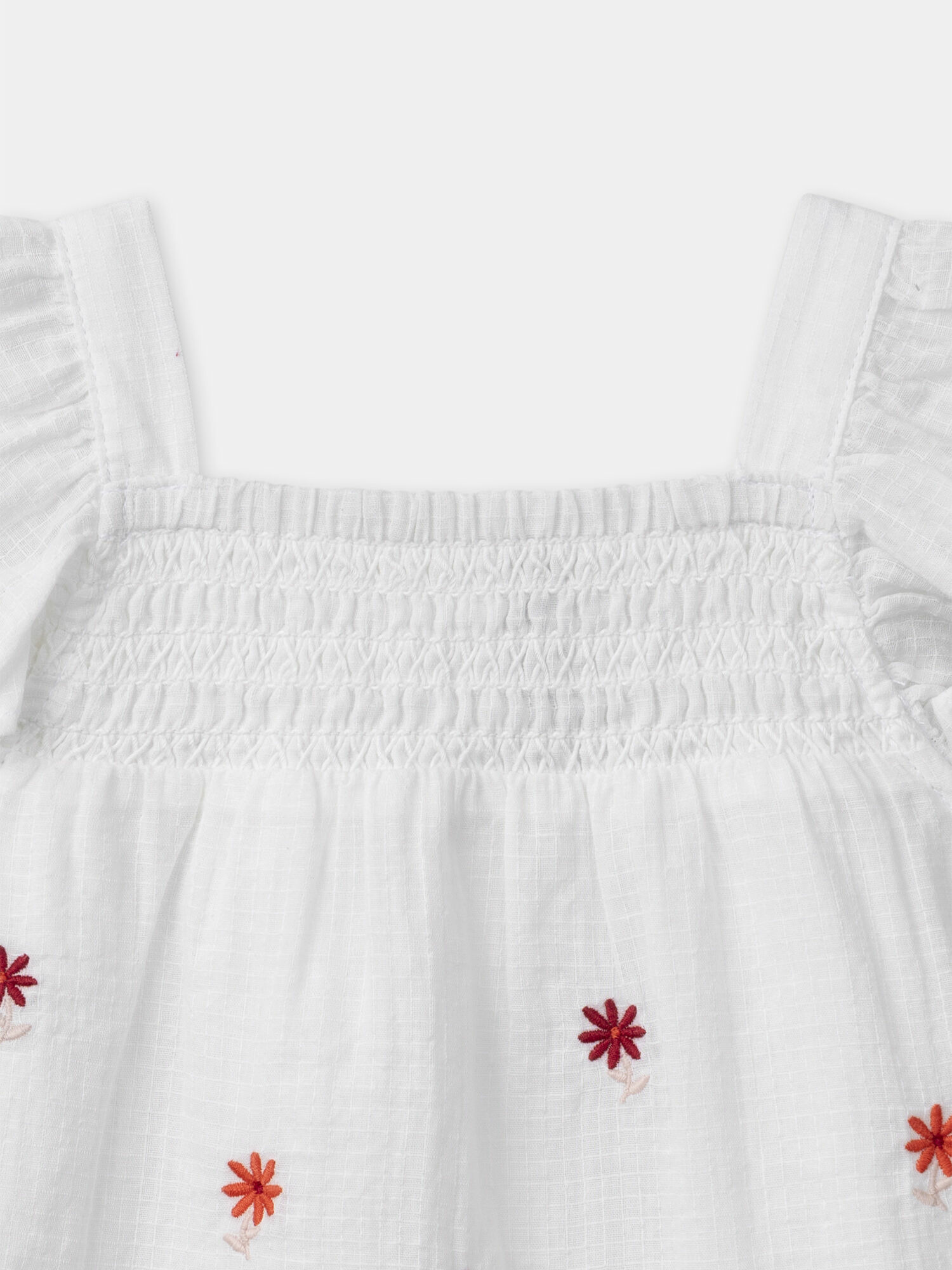 Fleurs brodées rouge et rose pâle, smock sur le buste pour une coupe ajustée et confortable, ouverture dos intégrale par boutons pour un enfilage facile. Référence produit : MALUCILE / 25E1BFJ1CHE001. Pour découvrir les qualités et caractéristiques environnementales, consultez la fiche produit dédiée.