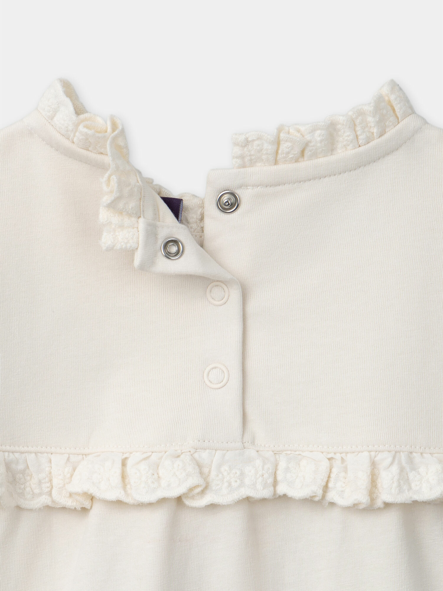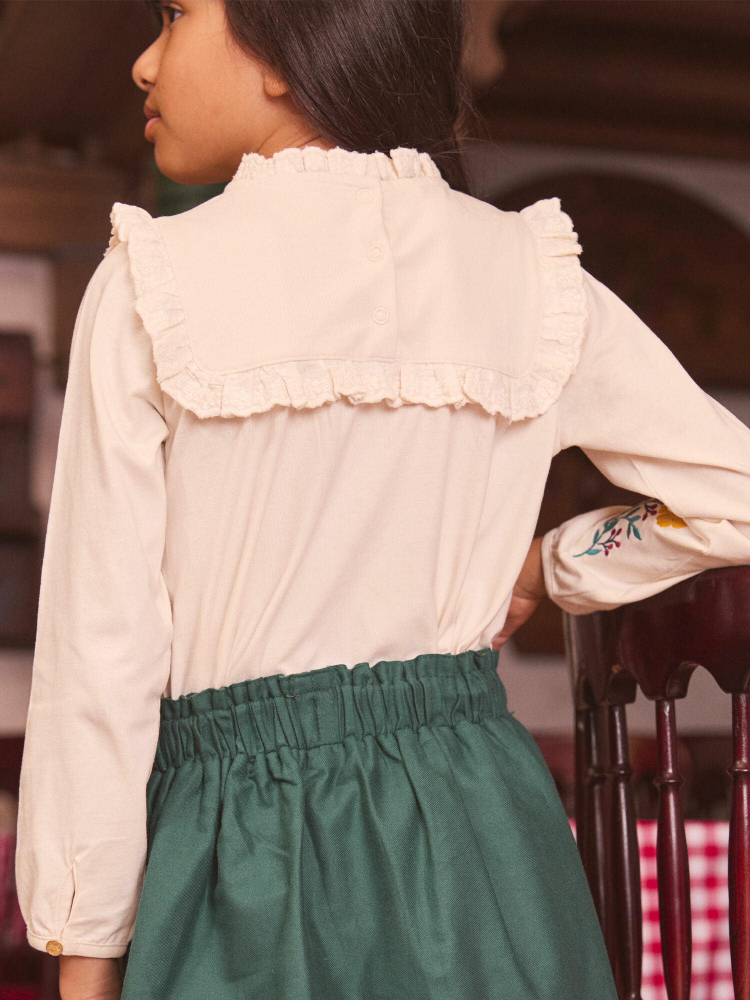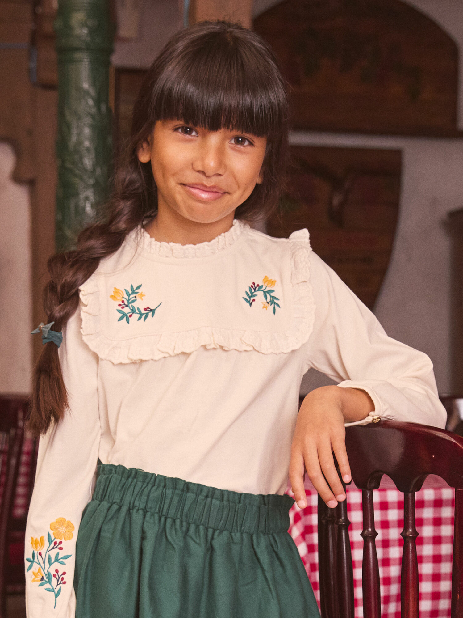 Blouse en jersey 100% coton, broderies florales délicates, mini volants à fleurs sur les épaules. Disponible en taille 6 ans. Référence produit : LYBLOETTE / 24H2PFO3TML632. Collection Marmelade à Edimbourg, marque Sergent Major.