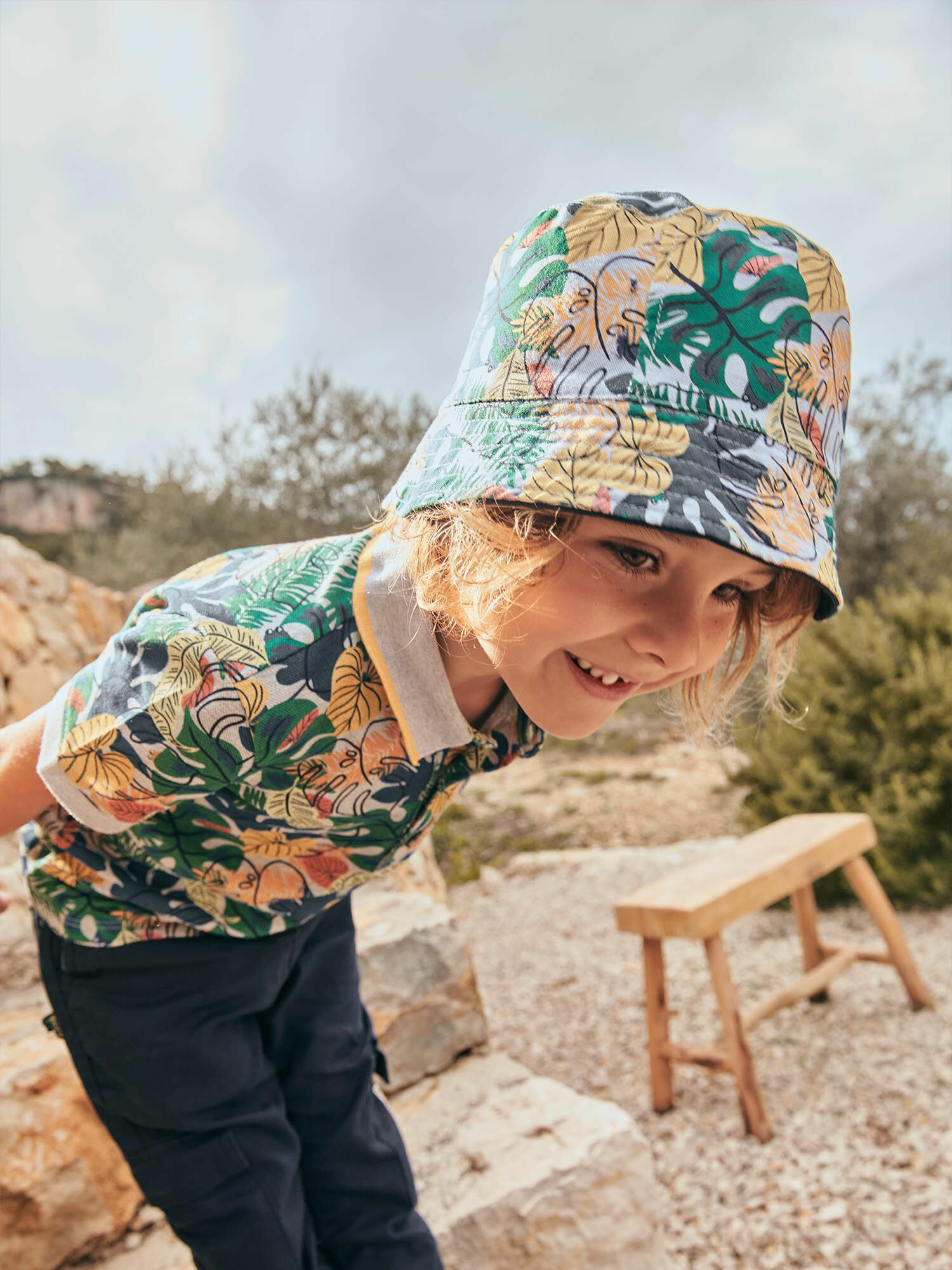Ce bob se distingue par son patch à motif tropical placé sur le devant, offrant une touche de fraîcheur subtile. En le retournant, découvrez un imprimé tropical intégral qui invite à l’évasion. Léger et confortable, il complète parfaitement les tenues décontractées tout en protégeant du soleil avec élégance. Intégré à la collection Papillon & Grenouille, il incarne un esprit nature et liberté.