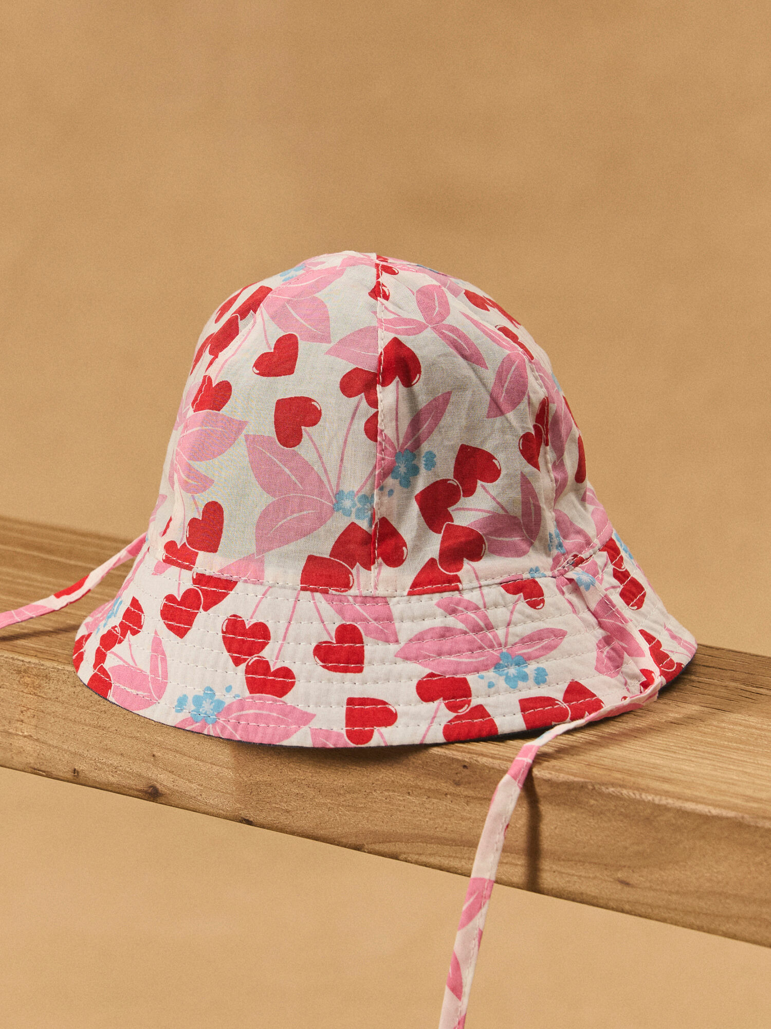 Ce bob réversible combine un imprimé cerises en forme de cœur sur fond écru et un micro-imprimé cerise sur denim, offrant deux looks complémentaires. Sa matière légère et douce assure confort et respirabilité, tandis que le lien à nouer sous le menton garantit un maintien optimal, même lors des journées actives. Intégré à la collection Bouquet de Cerises, il apporte une touche fraîche et ludique à toutes les tenues.