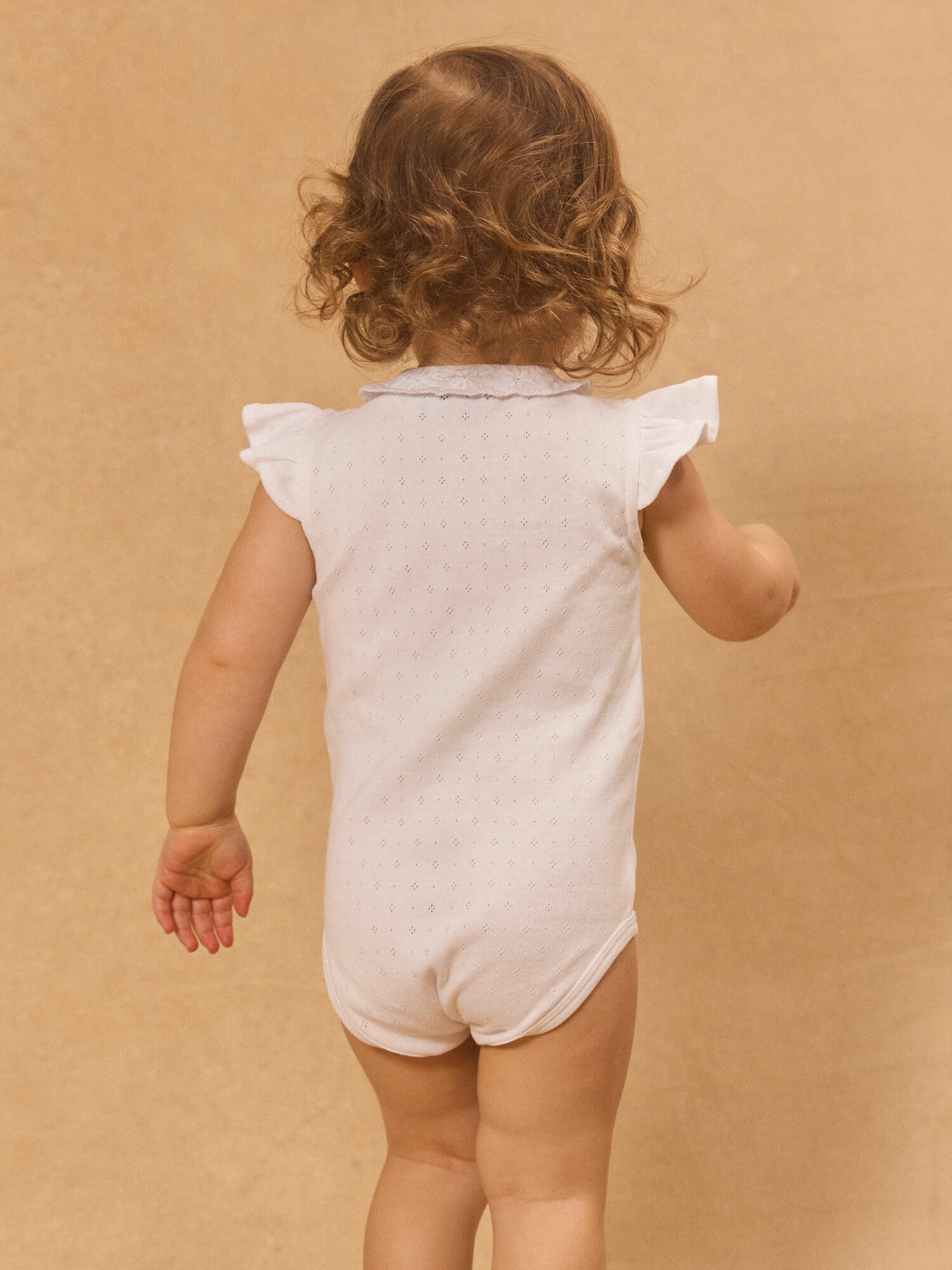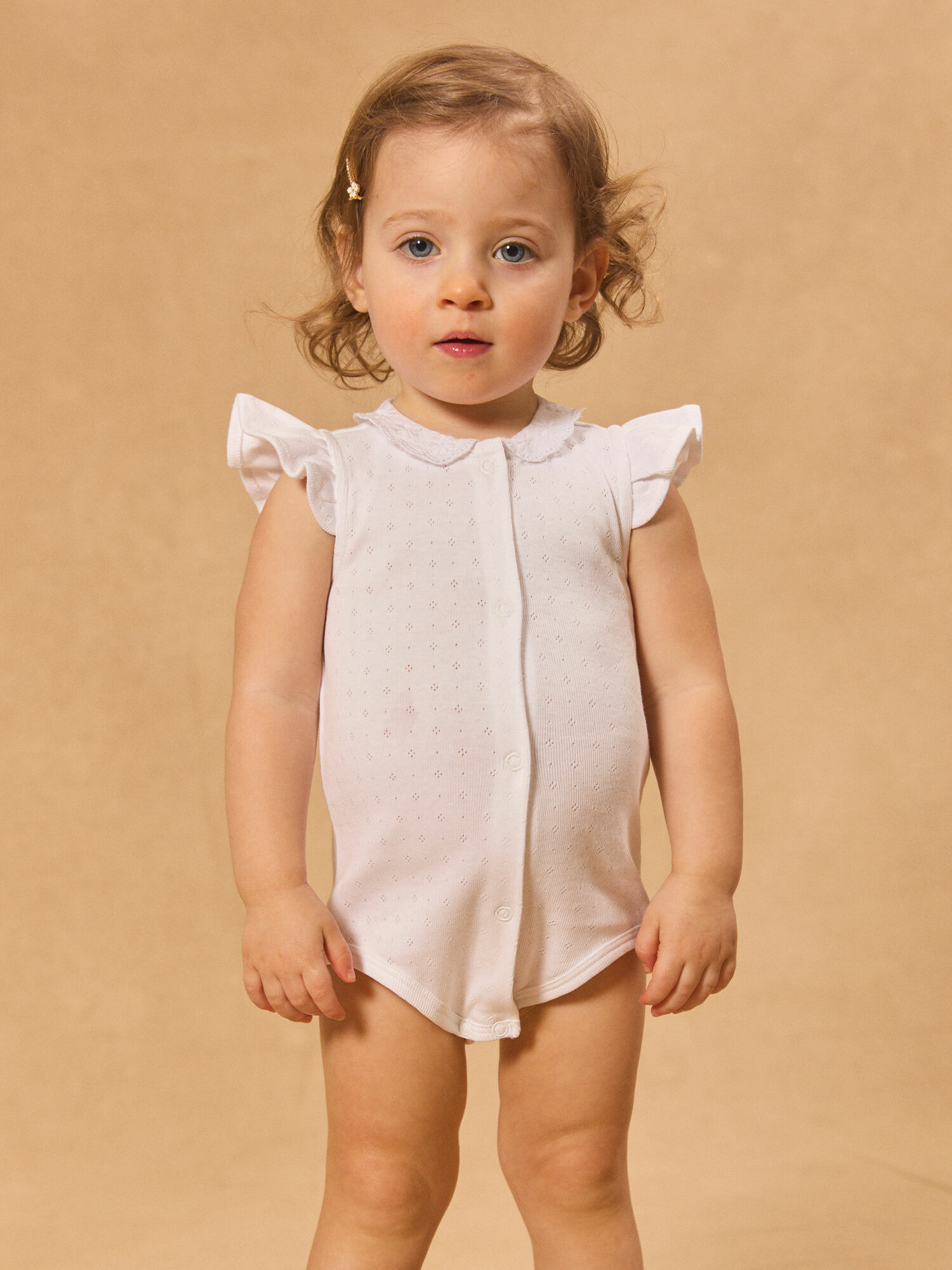 Col brodé délicat, manches volantes, ouverture avant intégrale et entrejambe sécurisée par boutons à pression en forme de fleurs. Ce modèle fait partie de la collection Ciel de Coton, alliant qualité et souci du détail.