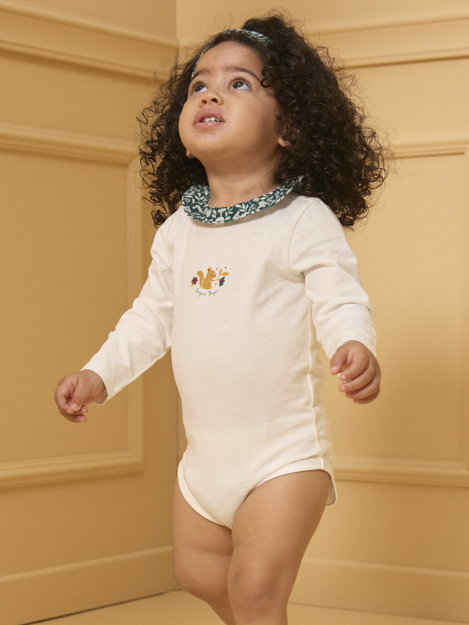 Offrez à votre bébé un confort élégant avec ce body écru signé Sergent Major. Son col en velours imprimé fleuri vert sombre et écru apporte une touche raffinée, tandis que l’imprimé écureuil sur le buste charme par sa douceur.
