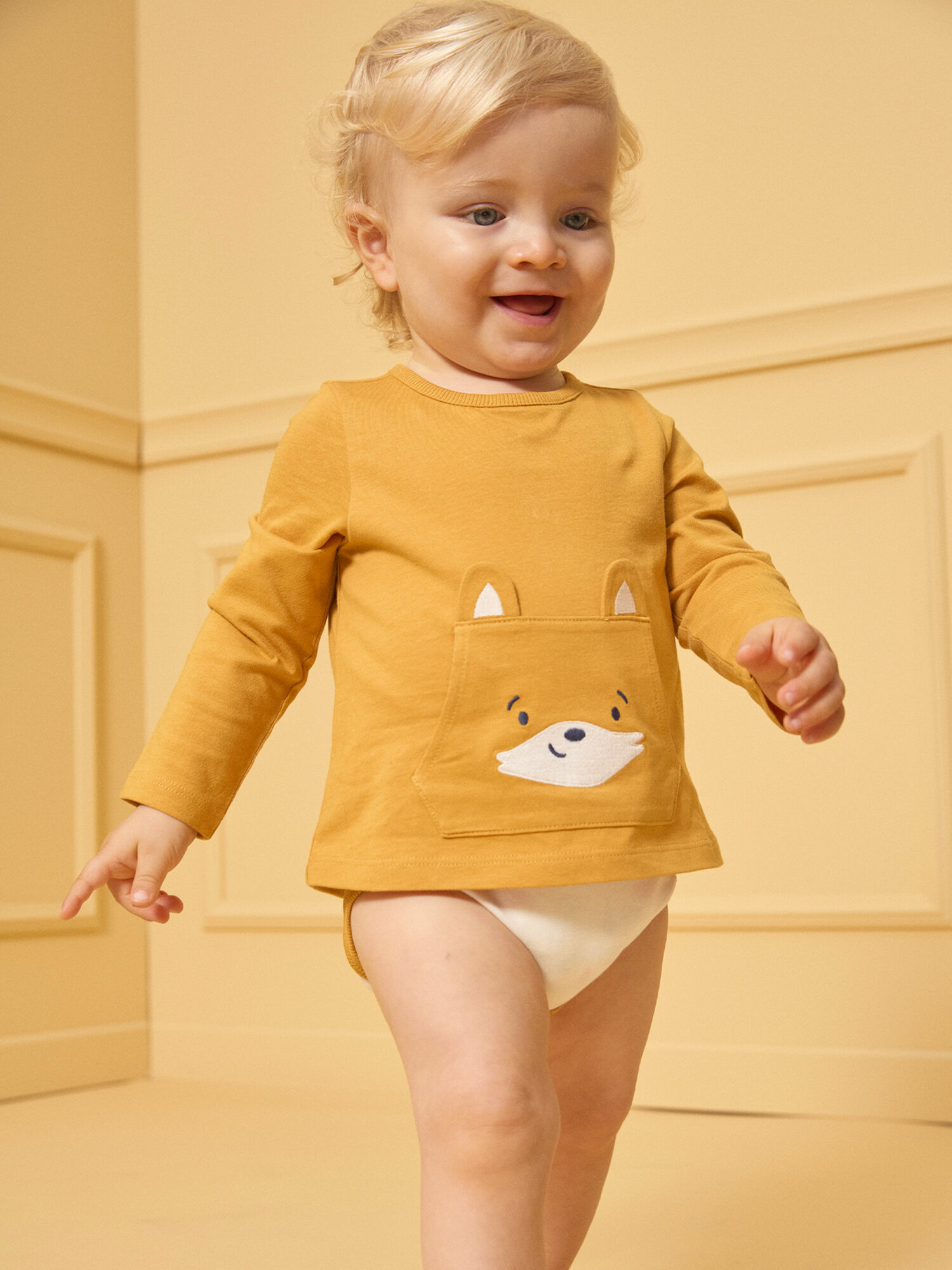 Confectionné en coton doux, ce body t-shirt à manches longues offre un confort optimal tout en apportant une touche de fantaisie grâce à sa poche kangourou ornée d’une tête de renard avec oreilles en 3D. Les biais contrastés jaune miel soulignent subtilement l’entrejambe, ajoutant une note colorée et moderne à ce vêtement pratique et stylé.