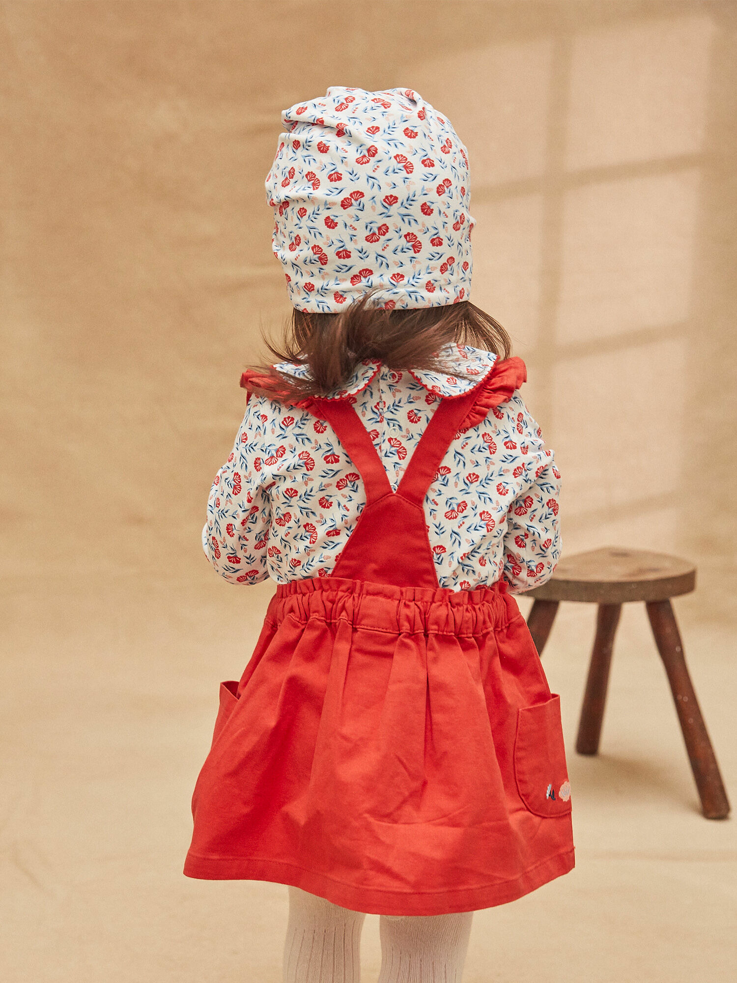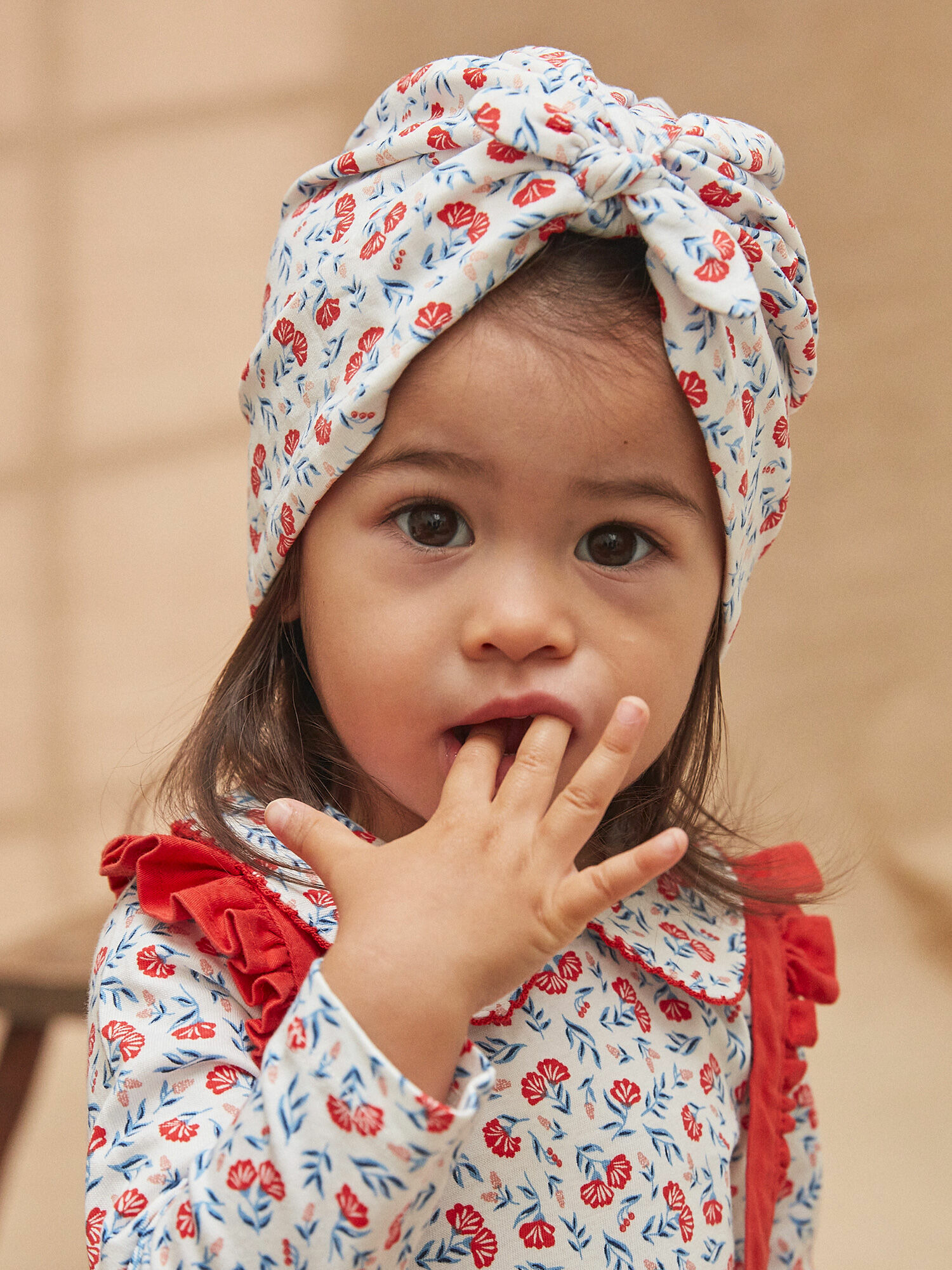 Confectionné en jersey souple, ce bonnet assure un maintien confortable tout au long de la journée. Le nœud noué sur l’avant souligne son style raffiné, tandis que l’imprimé fleurs et coquillages évoque la légèreté de la collection L’Echappée Basque. Parfait pour protéger la tête de votre enfant tout en sublimant son look.
